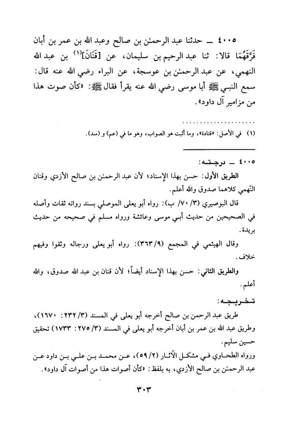 4005 - حدثنا عَبْدُ الرَّحْمَنِ بْنُ صَالِحٍ وَعَبْدُ اللَّهِ بْنُ عُمَرَ بْنِ أَبَانَ فَرَّقَهُمَا قَالَا: ثنا عَبْدُ الرَّحِيمِ بْنُ سُلَيْمَانَ، عَنْ [قَنَانِ] بْنِ عَبْدِ اللَّهِ النَّهْمِيِّ، عَنْ عَبْدِ الرَّحْمَنِ بْنِ عَوْسَجَةَ، عَنِ الْبَرَاءِ رَضِيَ الله عَنْه قَالَ: سَمِعَ النَّبِيُّ صَلَّى اللَّهُ عَلَيْهِ وَسَلَّمَ أَبَا مُوسَى رَضِيَ الله عَنْه يَقْرَأُ فَقَالَ صَلَّى اللَّهُ عَلَيْهِ وَسَلَّمَ: " §كَأَنَّ صَوْتَ هَذَا مِنْ مَزَامِيرِ آلِ دَاوُدَ ".