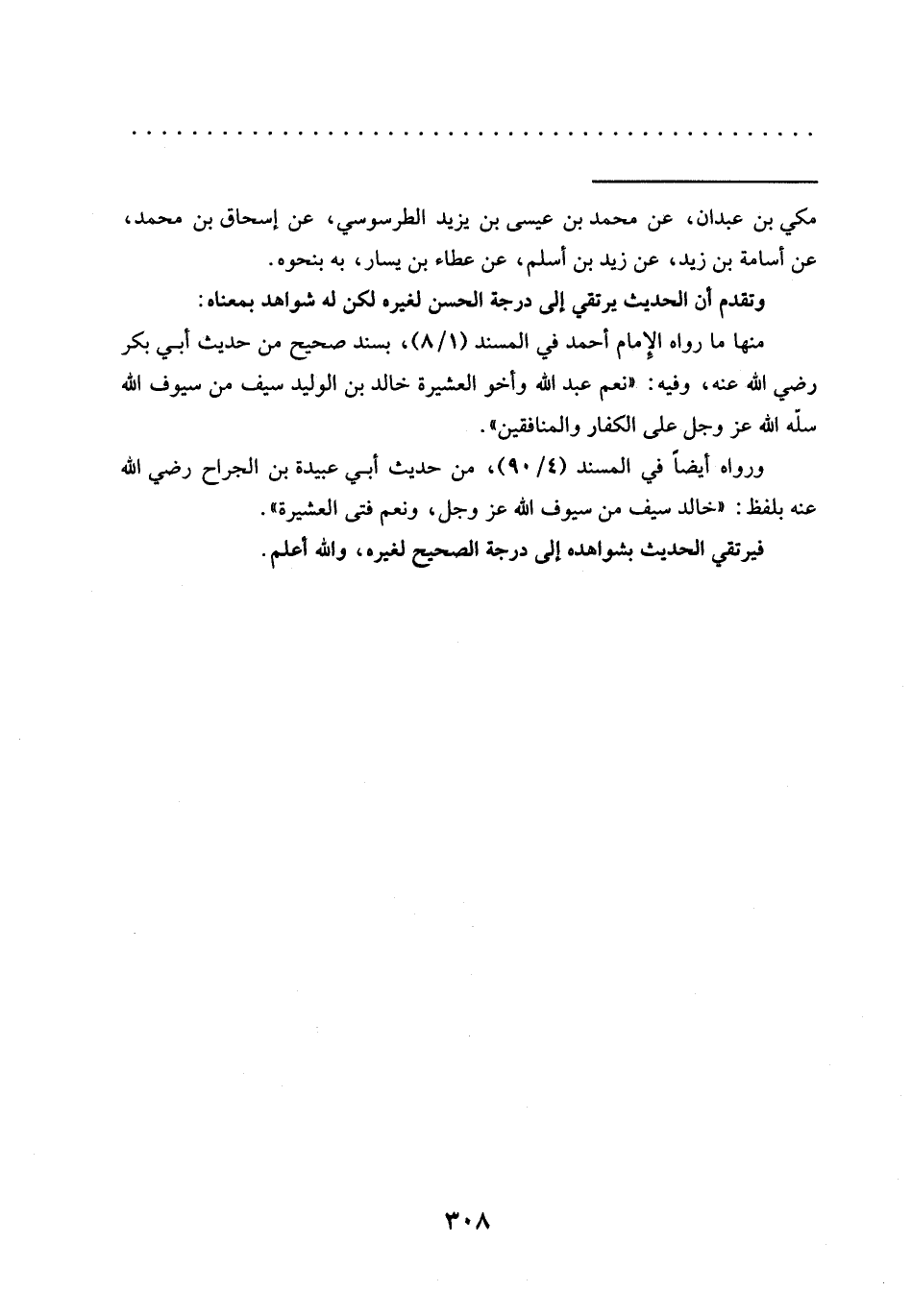 ورواه أيضًا في المسند (4/ 90)، من حديث أبي عبيدة بن الجراح رضي الله عنه بلفظ: "خالد سيف من سيوف الله عزَّ وجلّ، ونعم فتى العشيرة".