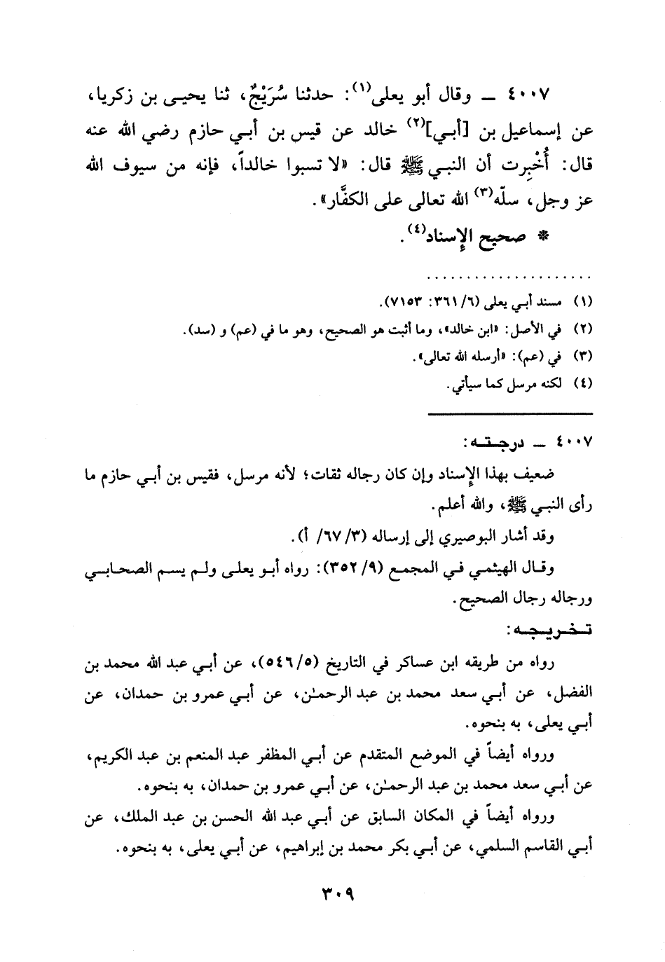 4007 - وَقَالَ أَبُو يَعْلَى: حَدَّثَنَا سُرَيْجٌ، ثنا يَحْيَى بْنُ زَكَرِيَّا، عَنْ إِسْمَاعِيلَ بن [أَبِي] خَالِدٍ عَنْ قَيْسٍ بن أَبِي حَازِمٍ رَضِيَ الله عَنْه قَالَ: أُخْبِرْتُ أَنَّ النَّبِيَّ صَلَّى اللَّهُ عَلَيْهِ وَسَلَّمَ قَالَ: " §لَا تَسُبُّوا خَالِدًا، فَإِنَّهُ مِنْ سيوف الله عز وجل، سلّه الله تعالى عَلَى الْكُفَّار ".