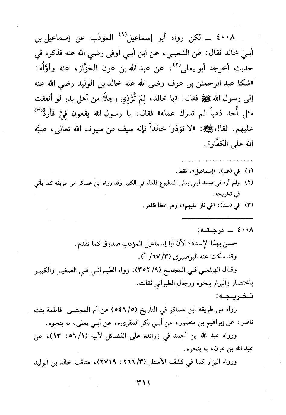 4008 - لَكِنْ رَوَاهُ أَبُو إِسْمَاعِيلَ (¬1) الْمُؤَدِّبُ عَنْ إِسْمَاعِيلَ بْنِ أَبِي خَالِدٍ فَقَالَ: عَنِ الشَّعْبِيِّ، عَنِ ابْنِ أَبِي أَوْفَى رَضِيَ اللَّهُ عَنْهُ فَذَكَرَهُ فِي حَدِيثٍ أَخْرَجَهُ أَبُو يَعْلَى (¬2)، عَنْ عبد الله بن عون الخزَّاز، عَنْهُ وأوَّلُه: "شَكَا عَبْدُ الرَّحْمَنِ بْنُ عَوْفٍ رضي الله عنه خالد بن الوليد رَضِيَ اللَّهُ عَنْهُ إِلَى رَسُولِ اللَّهِ -صَلَّى الله عليه وسلم- فَقَالَ: "يَا خَالِدُ، لِمَ تُؤْذِي رَجُلًا مِنْ أَهْلِ بَدْرٍ لَوْ أَنْفَقْتَ مِثْلَ أُحُدٍ ذَهَبًا لَمْ تُدْرِكْ عَمَلَهُ" فَقَالَ: يَا رَسُولَ اللَّهِ يقعون فيِّ فأردُّ (¬3) عليهم. فقال -صلى الله عليه وسلم-: "لَا تُؤْذُوا خَالِدًا فَإِنَّهُ سَيْفٌ مِنْ سُيُوفِ الله تعالى، صبَّه الله على الكفَّار".