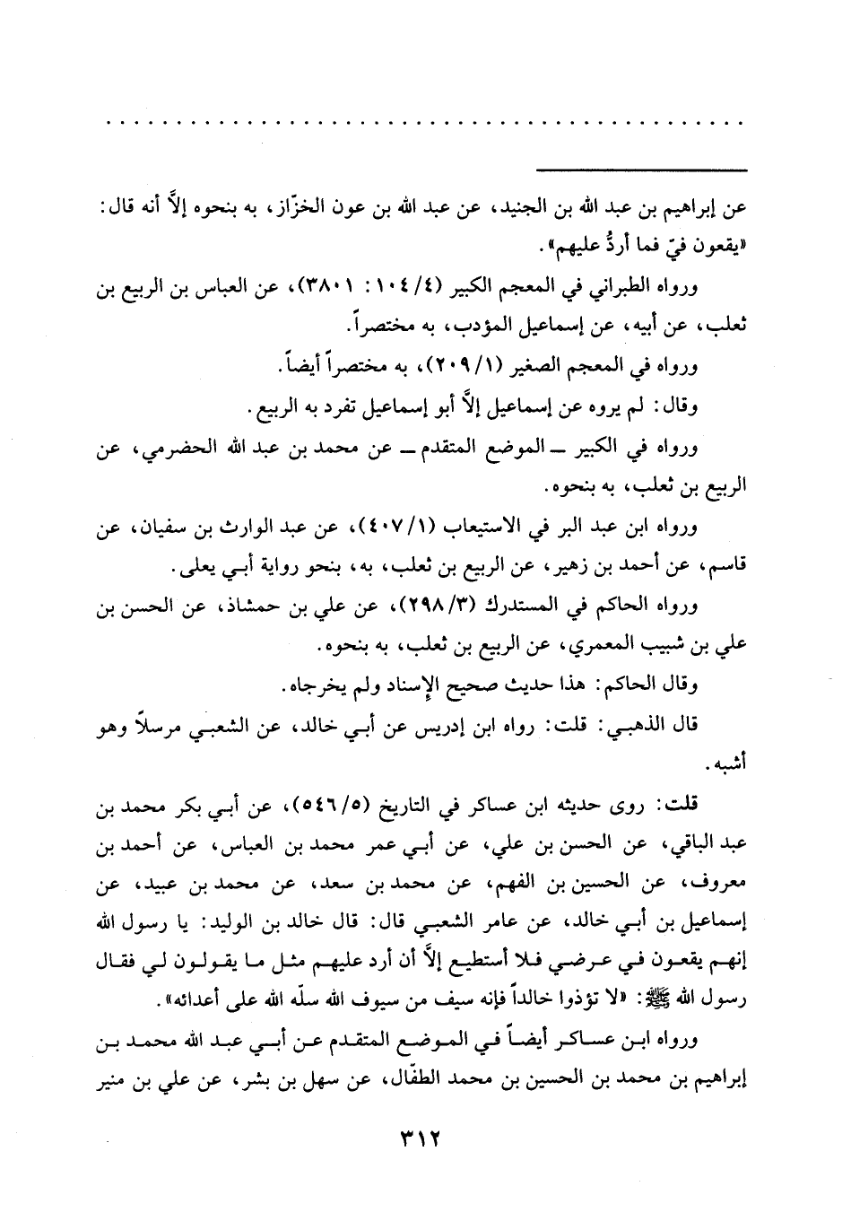 قلت: روى حديثه ابن عساكر في التاريخ (5/ 546)، عن أبي بكر محمَّد بن عبد الباقي، عن الحسن بن علي، عن أبي عمر محمَّد بن العباس، عن أحمد بن معروف، عن الحسين بن الفهم، عن محمد بن سعد، عن محمد بن عبيد، عن إسماعيل بن أبي خالد، عن عامر الشعبي قال: قال خالد بن الوليد: يا رسول الله إنهم يقعون في عرضي فلا أستطيع إلَّا أن أرد عليهم مثل ما يقولون لي فَقَالَ رَسُولُ اللَّهِ -صَلَّى اللَّهُ عَلَيْهِ وَسَلَّمَ-: "لَا تُؤْذُوا خَالِدًا فَإِنَّهُ سَيْفٌ مِنْ سُيُوفِ الله سلّه الله على أعدائه".