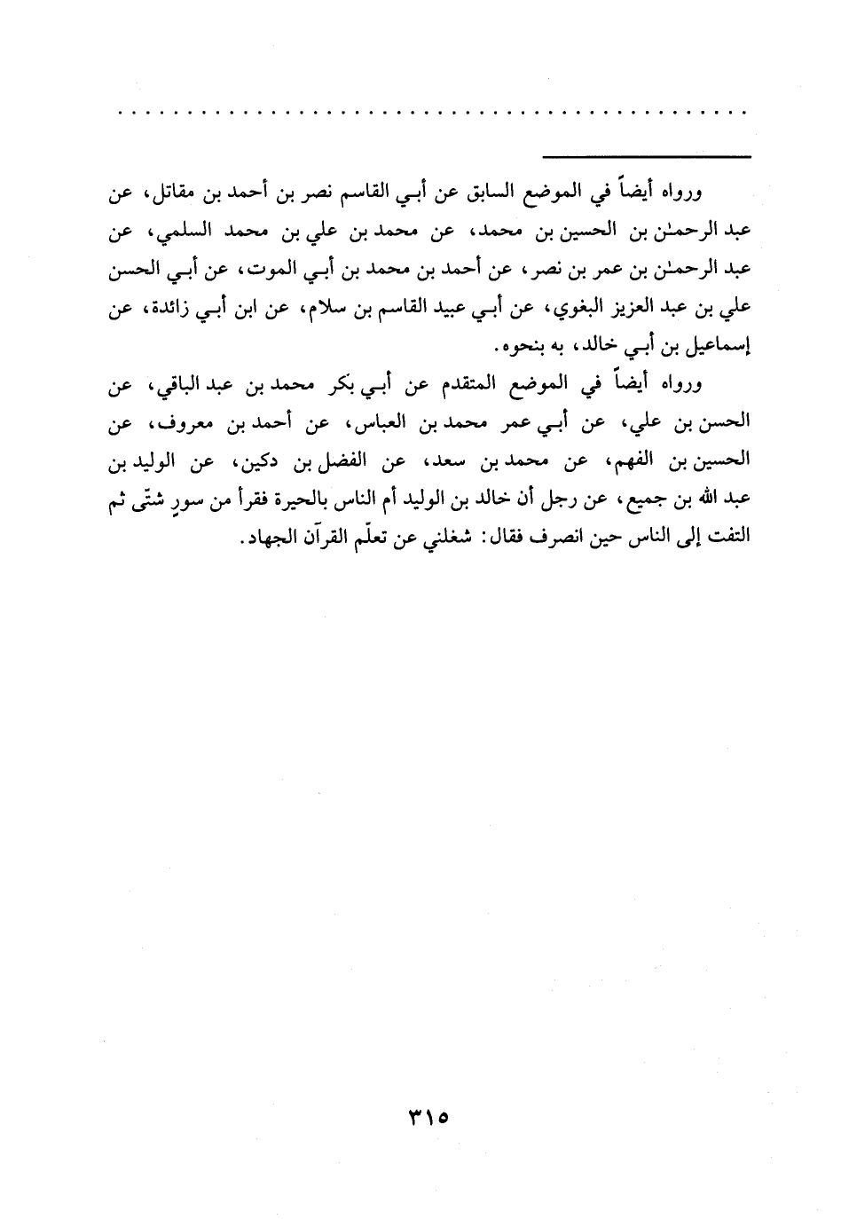 ورواه أيضًا في الموضع المتقدم عن أبي بكر محمَّد بن عبد الباقي، عن الحسن بن علي، عن أبي عمر محمد بن العباس، عن أحمد بن معروف، عن الحسين بن الفهم، عن محمد بن سعد، عن الفضل بن دكين، عن الوليد بن عبد الله بن جميع، عن رجل أن خالد بن الوليد أم الناس بالحيرة فقرأ من سورٍ شتّى ثم التفت إلى الناس حين انصرف فقال: شغلني عن تعلّم القرآن الجهاد.