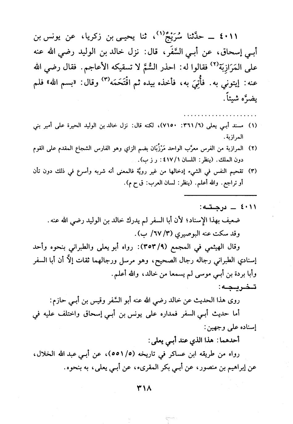 4011 - حَدَّثَنَا سُرَيْجُ، ثنا يَحْيَى بْنُ زَكَرِيَّا، عَنْ يُونُسَ بْنِ أَبِي إِسْحَاقَ، عَنْ أَبِي السَّفَرِ، قَالَ: نَزَلَ خَالِدُ بْنُ الْوَلِيدِ رَضِيَ الله عَنْه عَلَى الْمَرَازِبَةِ فَقَالُوا لَهُ: احْذَرِ السُّمَّ لَا تَسْقِيكَهُ الْأَعَاجِمُ. فَقَالَ رَضِيَ الله عَنْه: §إيتوني بِهِ. فَأُتِيَ بِهِ. فَأَخَذَهُ بِيَدِهِ ثُمَّ اقتحمه وقال: " بسم اللَّهِ " فَلَمْ يَضُرَّهُ شَيْئًا.