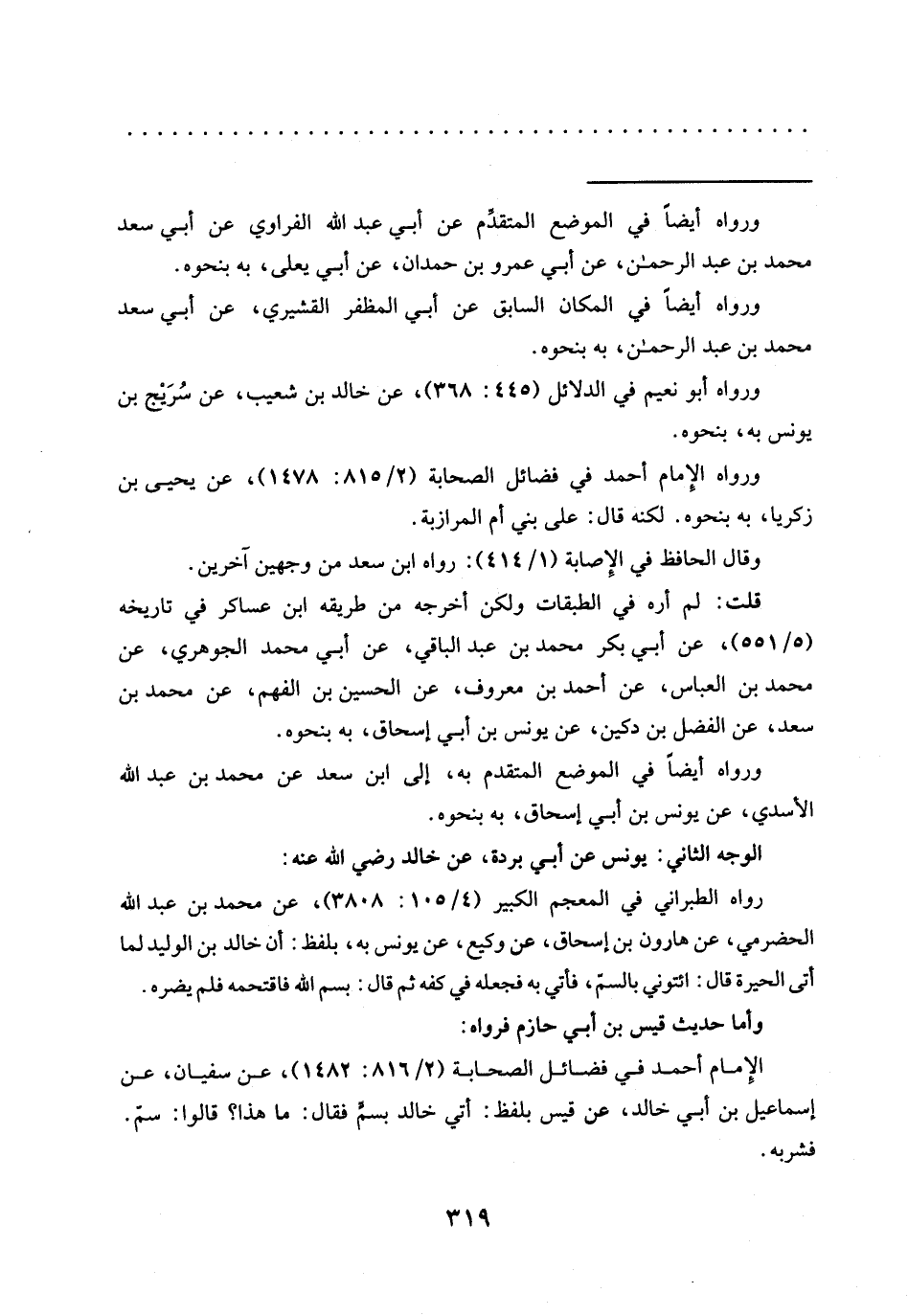 الإِمام أحمد في فضائل الصحابة (2/ 816: 1482)، عَنْ سُفْيَانَ، عَنْ إِسْمَاعِيلَ بْنِ أَبِي خَالِدٍ، عن قيس بلفظ: أتي خالد بسمٍّ فقال: ما هذا؟ قالوا: سمّ. فشربه. =