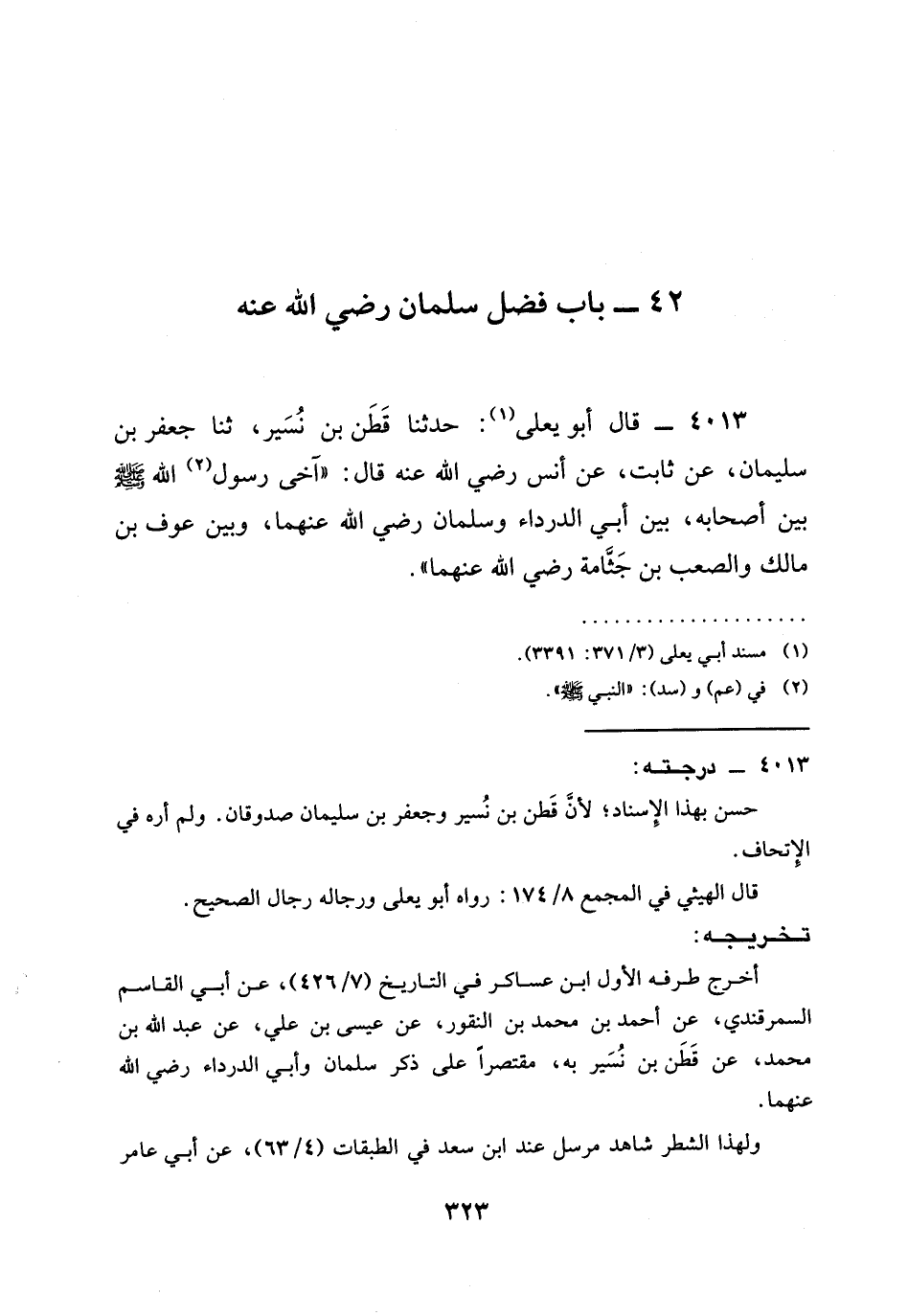 4013 - قَالَ أَبُو يَعْلَى: حدثنا قَطَنُ بْنُ نَسِيرٍ، ثنا جَعْفَرُ بْنُ سُلَيْمَانَ، عَنْ ثَابِتٍ، عَنْ أَنَسٍ رَضِيَ الله عَنْه قال: " §آخى رسول الله صَلَّى اللَّهُ عَلَيْهِ وَسَلَّمَ بَيْنَ أَصْحَابِهِ، بَيْنَ أَبِي الدرداء وسلمان رَضِيَ الله عَنْهما، وَبَيْنَ عَوْفِ بْنِ مَالِكٍ وَالصَّعْبِ بْنِ جثامة رَضِيَ الله عَنْهما ".