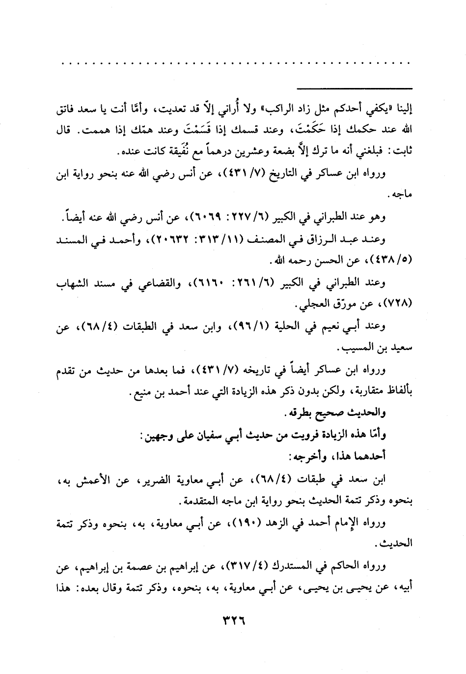 = إلينا "يكفي أحدكم مثل زاد الراكب" ولا أُراني إلَّا قد تعديت، وأمَّا أنت يا سعد فاتق الله عند حكمك إذا حَكَمْتَ، وعند قسمك إذا قَسَمْتَ وعند همّك إذا هممت. قال ثابت: فبلغني أنه ما ترك إلَّا بضعة وعشرين درهمًا مع نُفَيقة كانت عنده.
