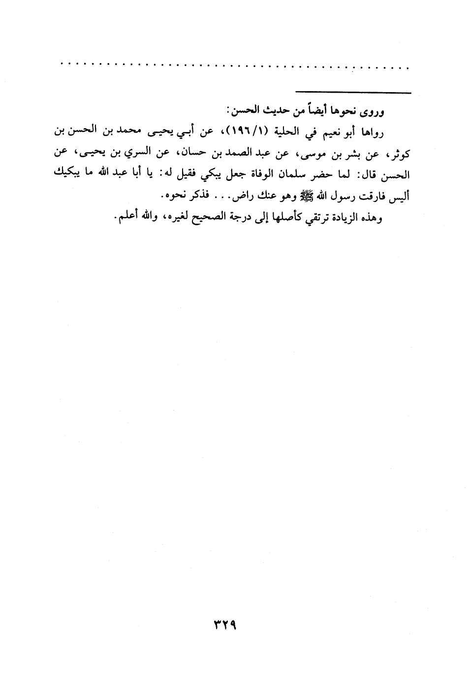 رواها أبو نعيم في الحلية (1/ 196)، عن أبي يحيى محمَّد بن الحسن بن كوثر، عن بشر بن موسى، عن عبد الصمد بن حسان، عن السري بن يحيى، عن الحسن قال: لما حضر سلمان الوفاة جعل يبكي فقيل له: يا أبا عبد الله ما يبكيك أليس فارقت رسول الله -صلى الله عليه وسلم- وهو عنك راض ... فذكر نحوه.