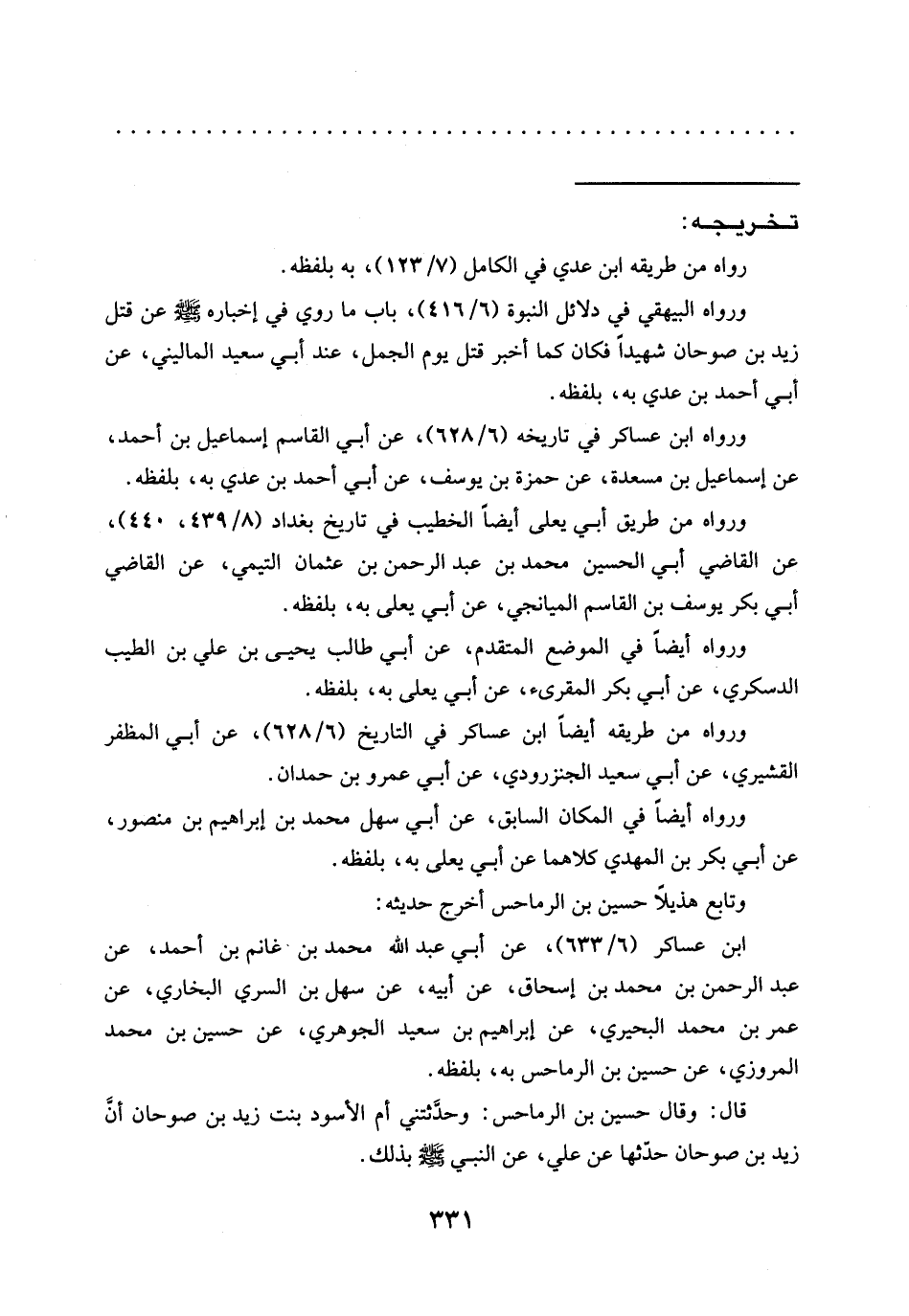 قال: وقال حسين بن الرماحس: وحدَّثتني أم الأسود بنت زيد بن صوحان أنَّ زيد بن صوحان حدّثها عَنْ عَلِيٍّ، عَنِ النَّبِيِّ -صَلَّى اللَّهُ عَلَيْهِ وسلم- بذلك.