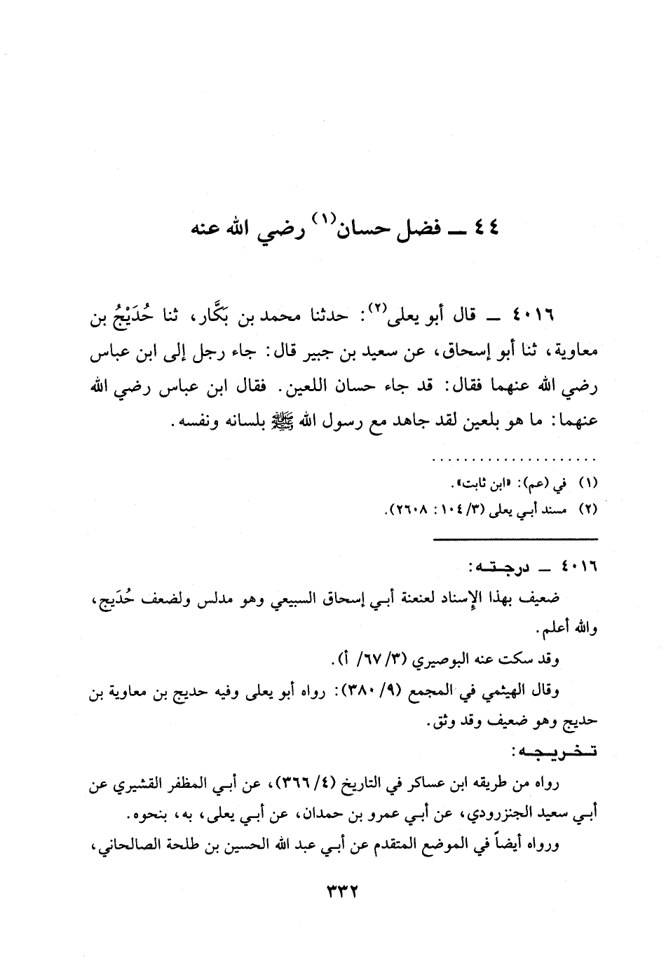 4016 - قَالَ أَبُو يَعْلَى: حدثنا مُحَمَّدُ بْنُ بَكَّارٍ، ثنا حُدَيْجُ بْنُ مُعَاوِيَةَ، ثنا أَبُو إِسْحَاقَ، عَنْ سَعِيدِ بْنِ جُبَيْرٍ قَالَ: جَاءَ رَجُلٌ إِلَى ابْنِ عباس رَضِيَ الله عَنْهما فَقَالَ: قَدْ جَاءَ حَسَّانُ اللَّعِينُ. فَقَالَ ابْنُ عباس رَضِيَ الله عَنْهما: §مَا هُوَ بِلَعِينٍ لَقَدْ جَاهَدَ مَعَ رَسُولِ اللَّهِ صَلَّى اللَّهُ عَلَيْهِ وَسَلَّمَ بِلِسَانِهِ وَنَفْسِهِ.