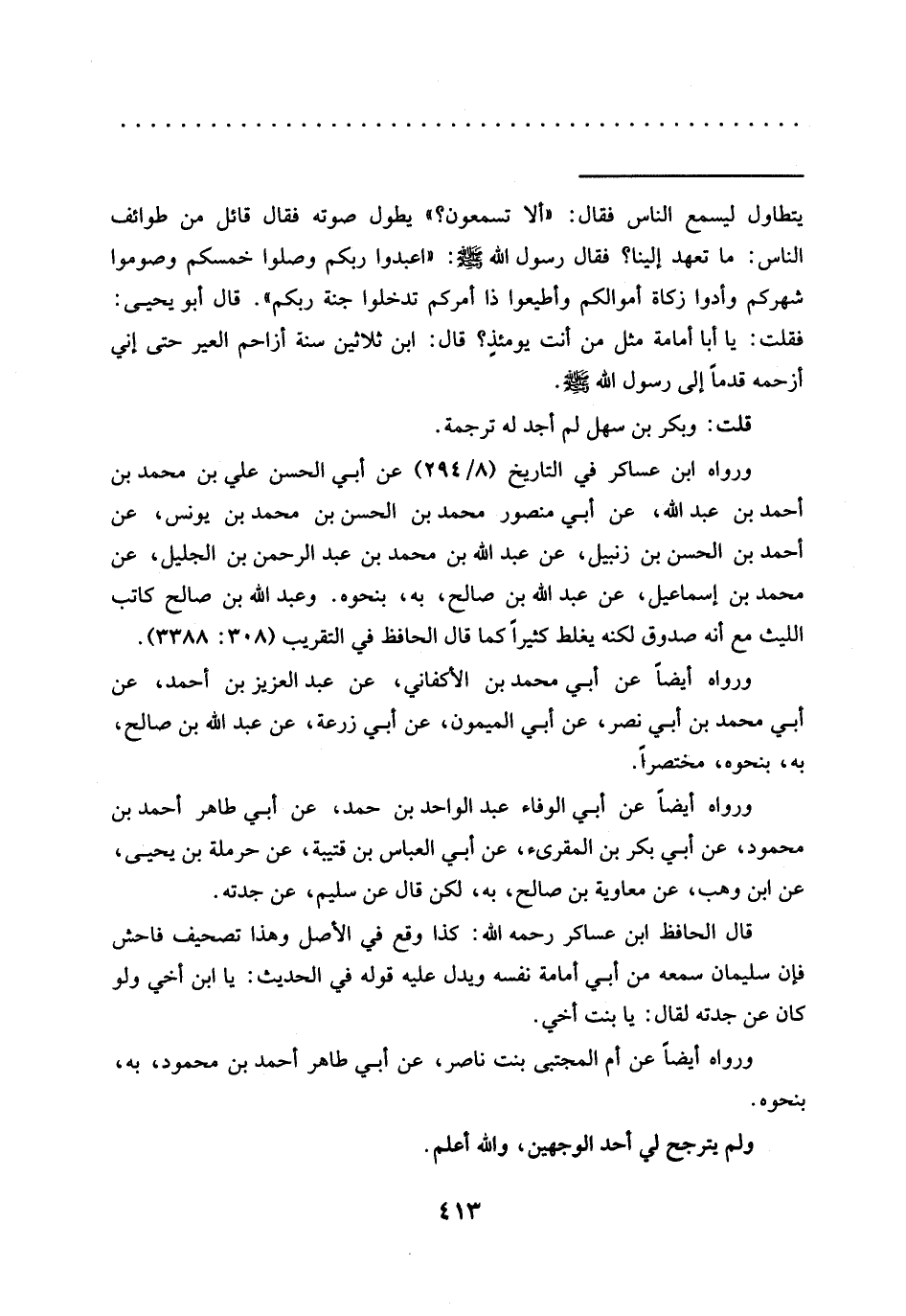 قال الحافظ ابن عساكر رحمه الله: كذا وقع في الأصل وهذا تصحيف فاحش فإن سليمان سمعه من أبي أمامة نفسه ويدل عليه قوله في الحديث: يا ابن أخي ولو كان عن جدته لقال: يا بنت أخي.