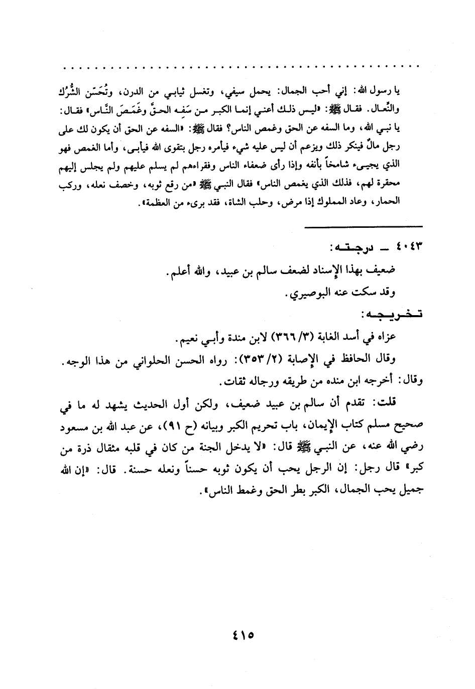 قلت: تقدم أن سالم بن عبيد ضعيف، ولكن أول الحديث يشهد له ما في صحيح مسلم كتاب الإِيمان، باب تحريم الكبر وبيانه (ح 91)، عَنْ عَبْدِ اللَّهِ بْنِ مَسْعُودٍ رَضِيَ اللَّهُ عنه، عَنِ النَّبِيِّ -صَلَّى اللَّهُ عَلَيْهِ وَسَلَّمَ- قَالَ: "لَا يَدْخُلُ الْجَنَّةَ مَنْ كَانَ فِي قَلْبِهِ مثقال ذرة من كبر" قال رجل: إن الرجل يحب أن يكون ثوبه حسنًا ونعله حسنة. قال: "إن الله جميل يحب الجمال، الكبر بطر الحق وغمط الناس".