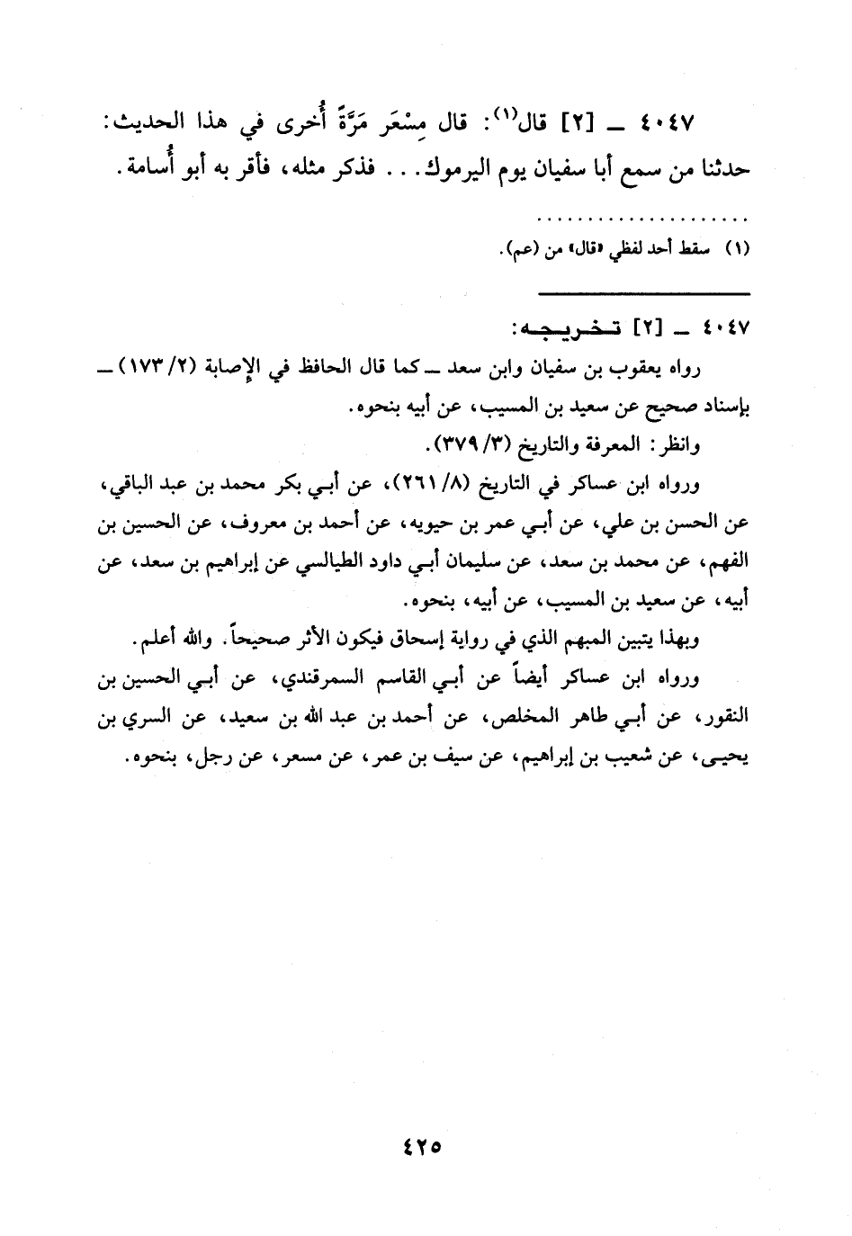 4047 - [2] قَالَ (¬1): قَالَ مِسْعَر مَرَّةً أُخرى فِي هَذَا الْحَدِيثِ: حَدَّثَنَا مَنْ سَمِعَ أَبَا سُفْيَانَ يَوْمَ الْيَرْمُوكِ ... فَذَكَرَ مِثْلَهُ، فَأَقَرَّ بِهِ أَبُو أُسامة.