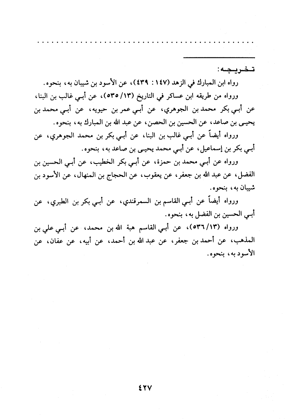 ورواه من طريقه ابن عساكر في التاريخ (13/ 535)، عن أبي غالب بن البنا، عن أبي بكر محمد بن الجوهري، عن أبي عمر بن حيويه، عن أبي محمَّد بن يحيى بن صاعد، عن الحسين بن الحصين، عن عبد الله بن المبارك به، بنحوه.