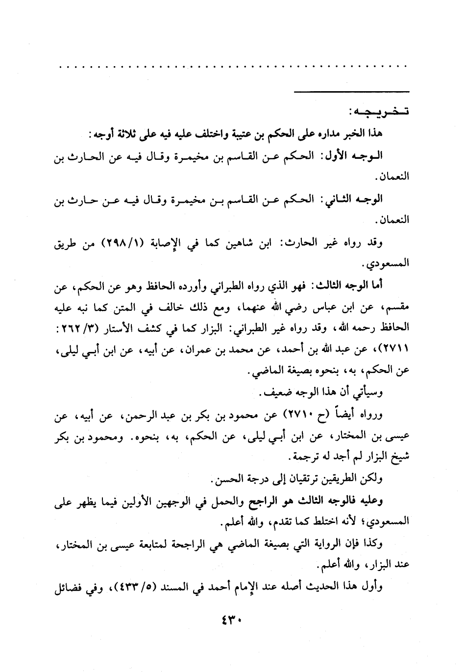 ورواه أيضًا (ح 2710) عَنْ مَحْمُودِ بْنِ بَكْرِ بْنِ عَبْدِ الرَّحْمَنِ، عن أبيه، عن عِيسَى بْنُ الْمُخْتَارِ، عَنِ ابْنِ أَبِي لَيْلَى، عن الحكم، به، بنحوه. ومحمود بن بكر شيخ البزّار لم أجد له ترجمة.