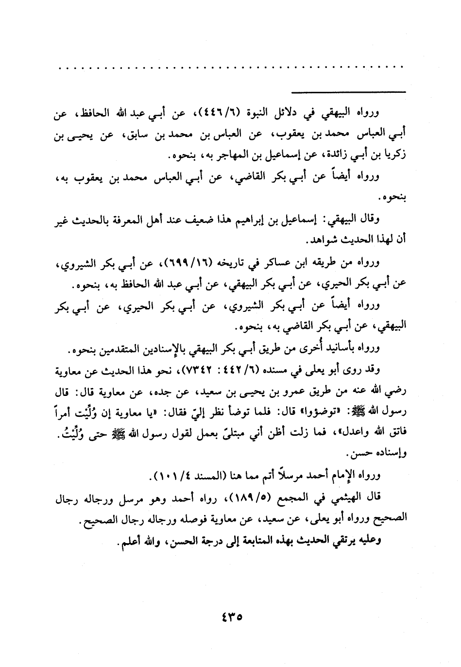 وقد روى أبو يعلى في مسنده (6/ 442: 7342)، نحو هذا الحديث عن معاوية رضي الله عنه من طريق عمرو بن يحيى بن سعيد، عن جده، عن معاوية قال: قال رسول الله: "توضؤوا" قال: فلما توضأ نظر إليّ فقال: "يا معاوية إن ولِّئيْت أمرًا فاتق الله واعدل"، فما زلت أظن أني مبتلىً بعمل لقول رسول الله -صلى الله عليه وسلم- حتى وُلِّيْتُ.