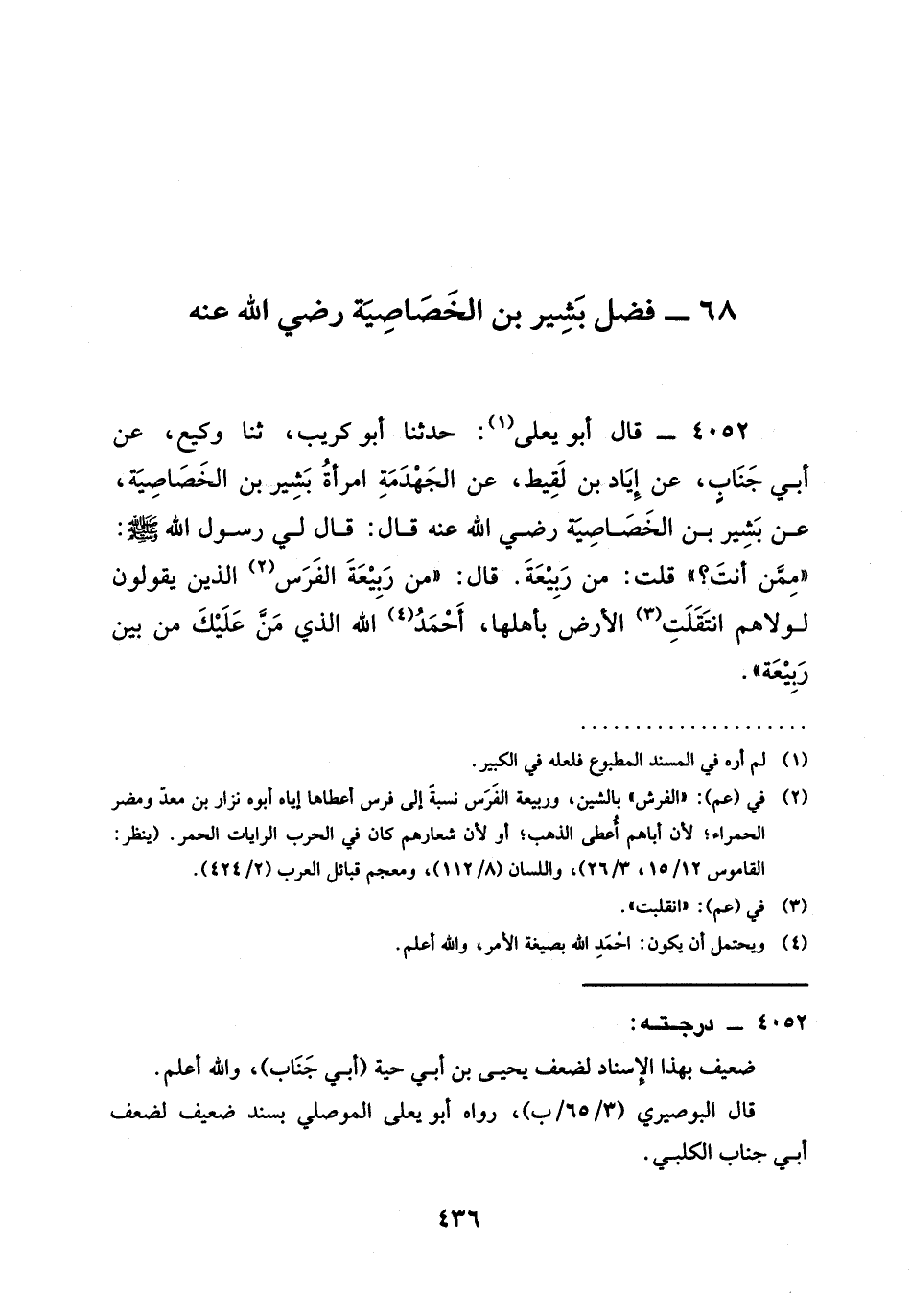 4052 - قَالَ أَبُو يَعْلَى: حدثنا أَبُو كُرَيْبٍ، ثنا وَكِيعٌ، عَنْ أَبِي جَنَابٍ، عَنْ إِيَادِ بْنِ لَقِيطٍ، عَنِ الْجَهْدَمَةِ امْرَأَةِ بَشِيرِ بن الْخَصَاصِيَةِ، عَنْ بَشِيرِ بن الْخَصَاصِيَةِ رَضِيَ الله عَنْه قَالَ: قَالَ لِي رَسُولُ اللَّهِ صَلَّى اللَّهُ عَلَيْهِ وَسَلَّمَ: " مِمَّنْ أَنْتَ؟ " قُلْتُ: مِنْ رَبِيعَةَ. قَالَ: " مِنْ رَبِيعَةَ الْفُرْسِ الَّذِينَ يَقُولُونَ لَوْلَاهُمُ انتقلت الْأَرْضُ بِأَهْلِهَا، §أَحْمَدُ اللَّهَ الَّذِي مَنَّ عَلَيْكَ مِنْ بَيْنِ رَبِيعَةَ ".