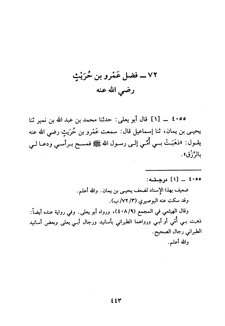4055 -[1] قَالَ أَبُو يَعْلَى: حدثنا مُحَمَّدُ بْنُ عَبْدِ اللَّهِ بْنِ نُمَيْرٍ ثنا يَحْيَى بْنُ يَمَانٍ، ثنا إِسْمَاعِيلُ قَالَ: سَمِعْتُ عَمْرَو بْنَ حُرَيْثٍ رَضِيَ الله عَنْه يَقُولُ: " ذَهَبَتْ بِي أُمِّي إِلَى رَسُولِ اللَّهِ صَلَّى اللَّهُ عَلَيْهِ وَسَلَّمَ §فَمَسَحَ بِرَأْسِي وَدَعَا لِي بِالرِّزْقِ -[444]- ".