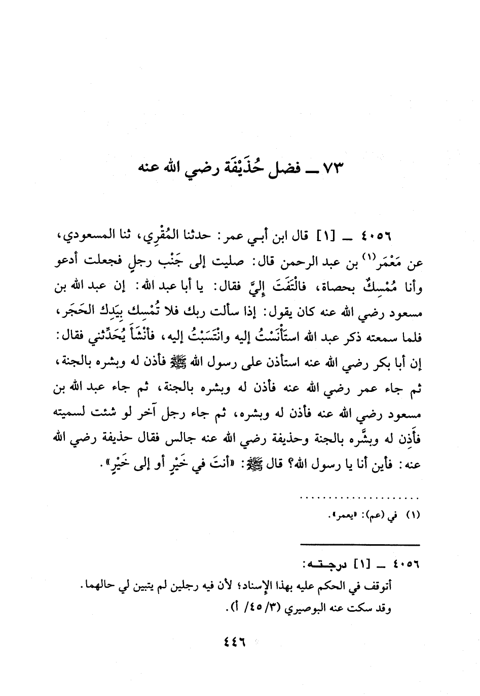 4056 -[1] قَالَ ابْنُ أَبِي عُمَرَ: حدثنا المقري، ثنا الْمَسْعُودِيُّ، عَنْ مَعْمَرِ بْنِ عَبْدِ الرَّحْمَنِ قَالَ: صَلَّيْتُ إِلَى جَنْبِ رَجُلٍ فَجَعَلْتُ أَدْعُو وَأَنَا مُمْسِكٌ بِحَصَاةٍ، فَالْتَفَتَ إِلَيَّ فَقَالَ: يَا أَبَا عَبْدِ اللَّهِ: إِنَّ عَبْدَ اللَّهِ بْنَ مَسْعُودٍ رَضِيَ الله عَنْه كَانَ يَقُولُ: إِذَا سَأَلْتَ رَبَّكَ فَلَا تُمْسِكْ بِيَدِكَ الْحَجَرَ، فَلَمَّا سَمِعْتُهُ ذَكَرَ عَبْدَ اللَّهِ اسْتَأْنَسْتُ إِلَيْهِ وَانْتَسَبْتُ إِلَيْهِ، فَأَنْشَأَ يُحَدِّثُنِي فَقَالَ: إِنَّ §أَبَا بَكْرٍ رَضِيَ الله عَنْه اسْتَأْذَنَ عَلَى رَسُولِ اللَّهِ صَلَّى اللَّهُ عَلَيْهِ وَسَلَّمَ فَأَذِنَ لَهُ وَبَشَّرَهُ بِالْجَنَّةِ، ثُمَّ جَاءَ عُمَرُ رَضِيَ الله عَنْه فَأَذِنَ لَهُ وَبَشَّرَهُ بِالْجَنَّةِ، ثُمَّ جَاءَ عَبْدُ اللَّهِ بْنُ مَسْعُودٍ رَضِيَ الله عَنْه فَأَذِنَ لَهُ وَبَشَّرَهُ، ثُمَّ جَاءَ رَجُلٌ آخَرُ لَوْ شِئْتُ لَسَمَّيْتُهُ فَأَذِنَ لَهُ وَبَشَّرَهُ بِالْجَنَّةِ وَحُذَيْفَةُ رَضِيَ الله عَنْه جَالِسٌ فَقَالَ حُذَيْفَةُ رَضِيَ الله عَنْه: فَأَيْنَ أَنَا يَا رَسُولَ الله؟ قال صَلَّى اللَّهُ عَلَيْهِ وَسَلَّمَ: " أَنْتَ فِي خَيْرٍ أَوْ إِلَى خَيْرٍ -[448]- ".