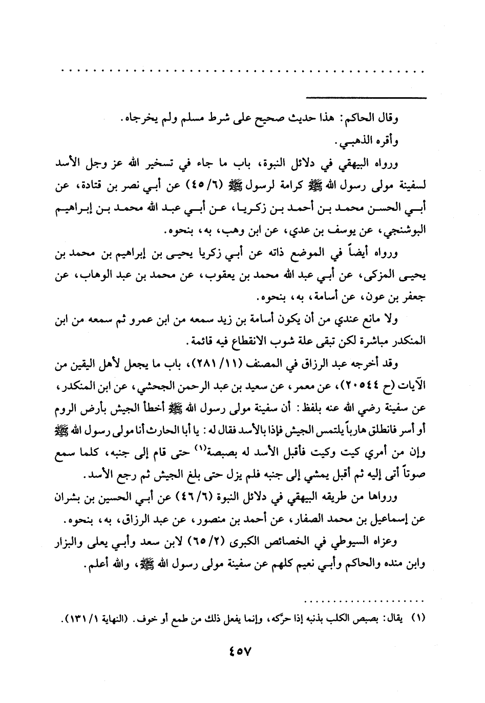 ورواه البيهقي في دلائل النبوة، باب ما جاء في تسخير الله عَزَّ وَجَلَّ الأسد لسفينة مَوْلَى رَسُولِ اللَّهِ -صَلَّى اللَّهُ عَلَيْهِ وَسَلَّمَ- كرامة لرسول -صلى الله عليه وسلم- (6/ 45) عن أبي نصر بن قتادة، عن أبي الحسن محمَّد بن أحمد بن زكريا، عن أبي عبد الله محمَّد بن إبراهيم البوشنجي، عن يوسف بن عدي، عن ابن وهب، به، بنحوه.