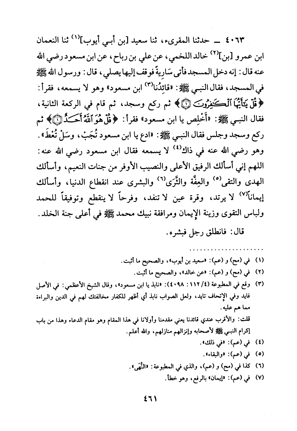 4063 - حَدَّثَنَا الْمُقْرِئُ، ثنا سَعِيدُ [بْنُ أَبِي أَيُّوبَ] ثنا النُّعْمَانُ ابن عَمْرِو [بْنِ] خَالِدٍ اللَّخْمِيُّ، عَنْ عُلَيِّ بْنِ رَبَاحٍ، عَنِ ابن مسعود رَضِيَ الله عَنْه قال: إِنَّهُ دَخَلَ الْمَسْجِدَ فَأَتَى سَارِيَةً فَوَقَفَ إليها يصلي، قال: وَرَسُولُ اللَّهِ صَلَّى اللَّهُ عَلَيْهِ وَسَلَّمَ فِي الْمَسْجِدِ، فقال النبي صَلَّى اللَّهُ عَلَيْهِ وَسَلَّمَ: " §قائدنا ابْن مَسْعُودٍ " وَهُوَ لَا يَسْمَعُهُ، فقرأ: {قل يأيها الْكَافِرُونَ (1) } ثُمَّ رَكَعَ وَسَجَدَ، ثُمَّ قَامَ فِي الرَّكْعَةِ الثَّانِيَةِ، فَقَالَ النَّبِيُّ صَلَّى اللَّهُ عَلَيْهِ وَسَلَّمَ: " أَخْلِصْ يَا ابْنَ مَسْعُودٍ " فَقَرَأَ: {قُلْ هُوَ اللَّهُ أَحَدٌ (1) } ثُمَّ رَكَعَ وَسَجَدَ وَجَلَسَ فَقَالَ النَّبِيُّ صَلَّى اللَّهُ عَلَيْهِ وَسَلَّمَ: " ادْعُ يَا ابْنَ مَسْعُودٍ تُجَبْ، وَسَلْ تُعْطَ ". وَهُوَ رَضِيَ الله عَنْه فِي ذَاكَ لَا يَسْمَعُهُ فَقَالَ ابْنُ مَسْعُودٍ رَضِيَ الله عَنْه: اللَّهُمَّ إِنِّي أَسْأَلُكَ الرَّفِيقَ الْأَعْلَى وَالنَّصِيبَ الْأَوْفَرَ مِنْ جَنَّاتِ النَّعِيمِ، وَأَسْأَلُكَ الْهُدَى وَالتُّقَى وَالْعِفَّةَ والثرى وَالْبُشْرَى عِنْدَ انْقِطَاعِ الدُّنْيَا، وَأَسْأَلُكَ إِيمَانًا لَا يَرْتَدَّ، وَقُرَّةَ عَيْنٍ لَا تَنْفَدُ، وَفَرَحًا لَا يَنْقَطِعُ وَتَوْفِيقًا لِلْحَمْدِ وَلِبَاسَ التَّقْوَى وَزِينَةَ الْإِيمَانِ وَمُرَافَقَةَ نَبِيِّكَ مُحَمَّدٍ صَلَّى اللَّهُ عَلَيْهِ وَسَلَّمَ فِي أَعْلَى جَنَّةِ الْخُلْدِ.