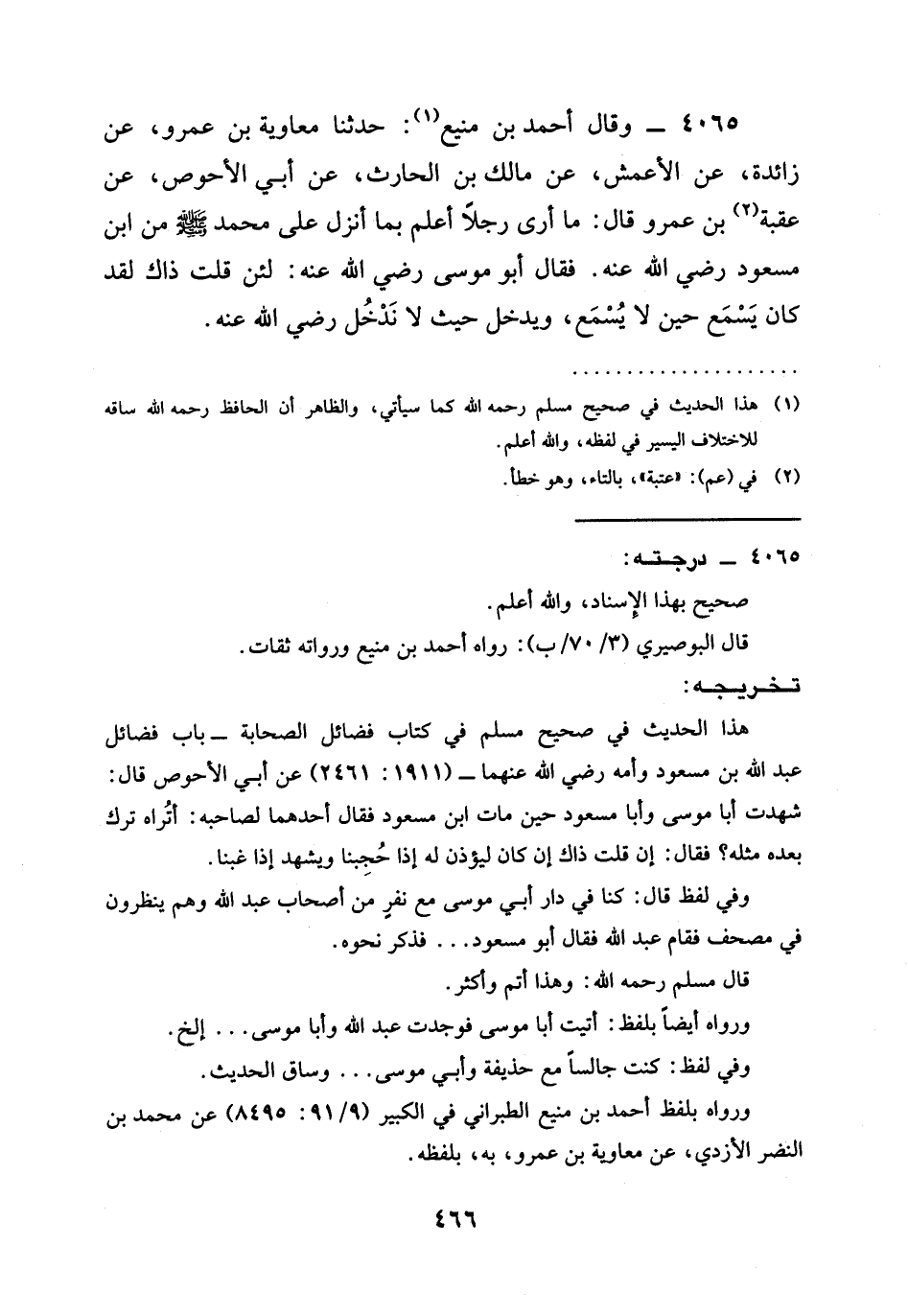 4065 - وَقَالَ أَحْمَدُ بْنُ مَنِيعٍ: حدثنا مُعَاوِيَةُ بْنُ عَمْرٍو، عَنْ زَائِدَةَ، عَنِ الْأَعْمَشِ، عَنْ مَالِكِ بْنِ الْحَارِثِ، عَنْ أَبِي الأحوص، عن عقبة بْنِ عَمْرٍو قَالَ: مَا أَرَى رَجُلًا أَعْلَمَ بِمَا أَنْزَلَ عَلَى مُحَمَّدٍ صَلَّى اللَّهُ عَلَيْهِ وَسَلَّمَ مِنَ ابْنِ مَسْعُودٍ رَضِيَ الله عَنْه. فَقَالَ أَبُو مُوسَى رَضِيَ الله عَنْه: لئن قلت ذاك لَقَدْ كَانَ §يَسْمَعُ حِينَ لا يُسمع، وَيَدْخُلُ حَيْثُ لَا نَدْخُلُ رَضِيَ الله عَنْه.