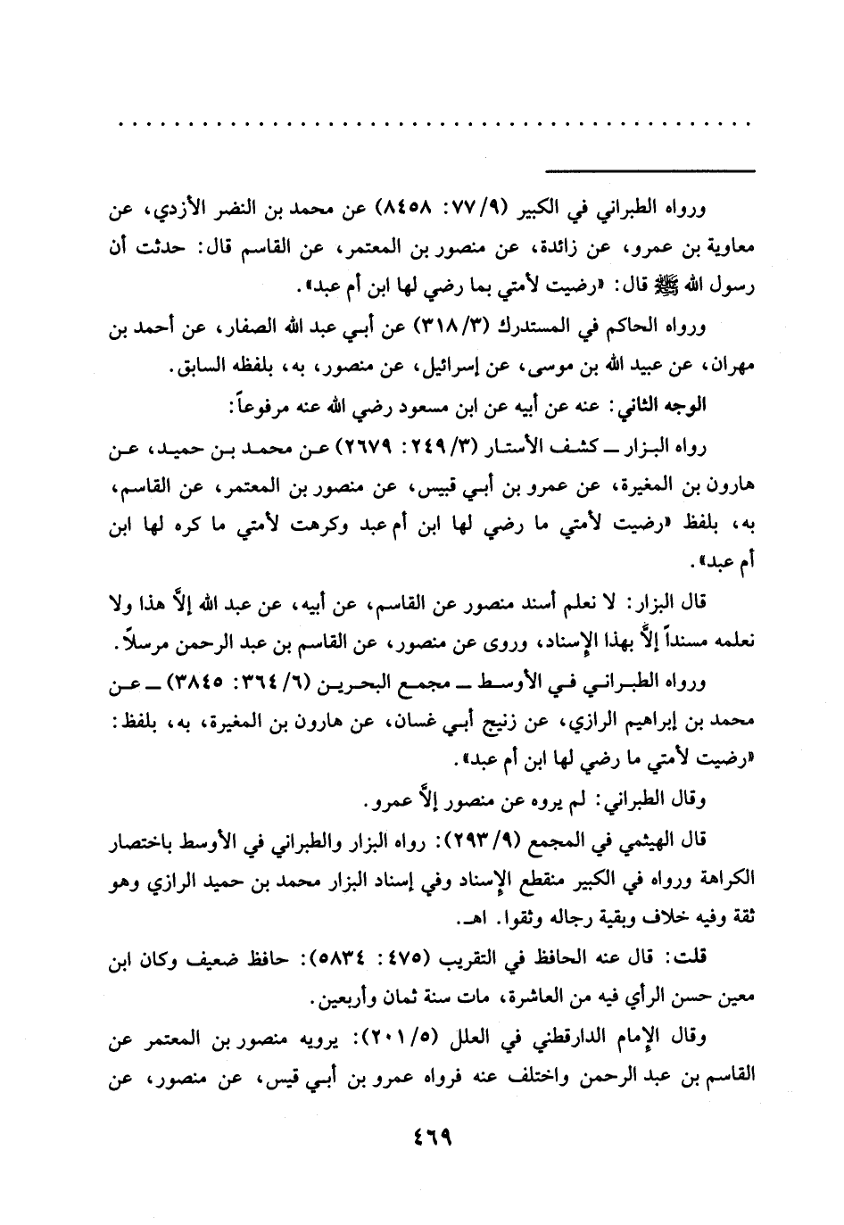 =ورواه الطبراني في الكبير (9/ 77: 8458) عن محمَّد بن النضر الأزدي، عن معاوية بن عمرو، عن زائدة، عن منصور بن المعتمر، عن القاسم قال: حدثت أن رسول الله قال: "رضيت لأمتي بما رضي لها ابن أم عبد".