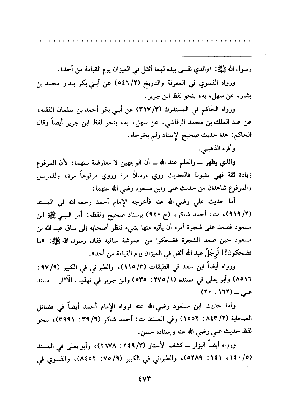 أما حديث علي رضي الله عنه فأخرجه الإِمام أحمد رحمه الله في المسند (2/ 919)، ت: أحمد شاكر، (ح 920) بإسناد صحيح ولفظه: أمر النبي -صلى الله عليه وسلم- ابن مسعود فصعد على شجرة أمره أن يأتيه منها بشيء فنظر أصحابه إلى ساق عبد الله بن مسعود حين صعد الشجرة فضحكوا من حموشة ساقيه فَقَالَ رَسُولُ اللَّهِ -صَلَّى اللَّهُ عَلَيْهِ وَسَلَّمَ-: "ما تضحكون؟! لَرِجْلُ عبد الله أثقل في الميزان يوم القيامة من أحدًا.