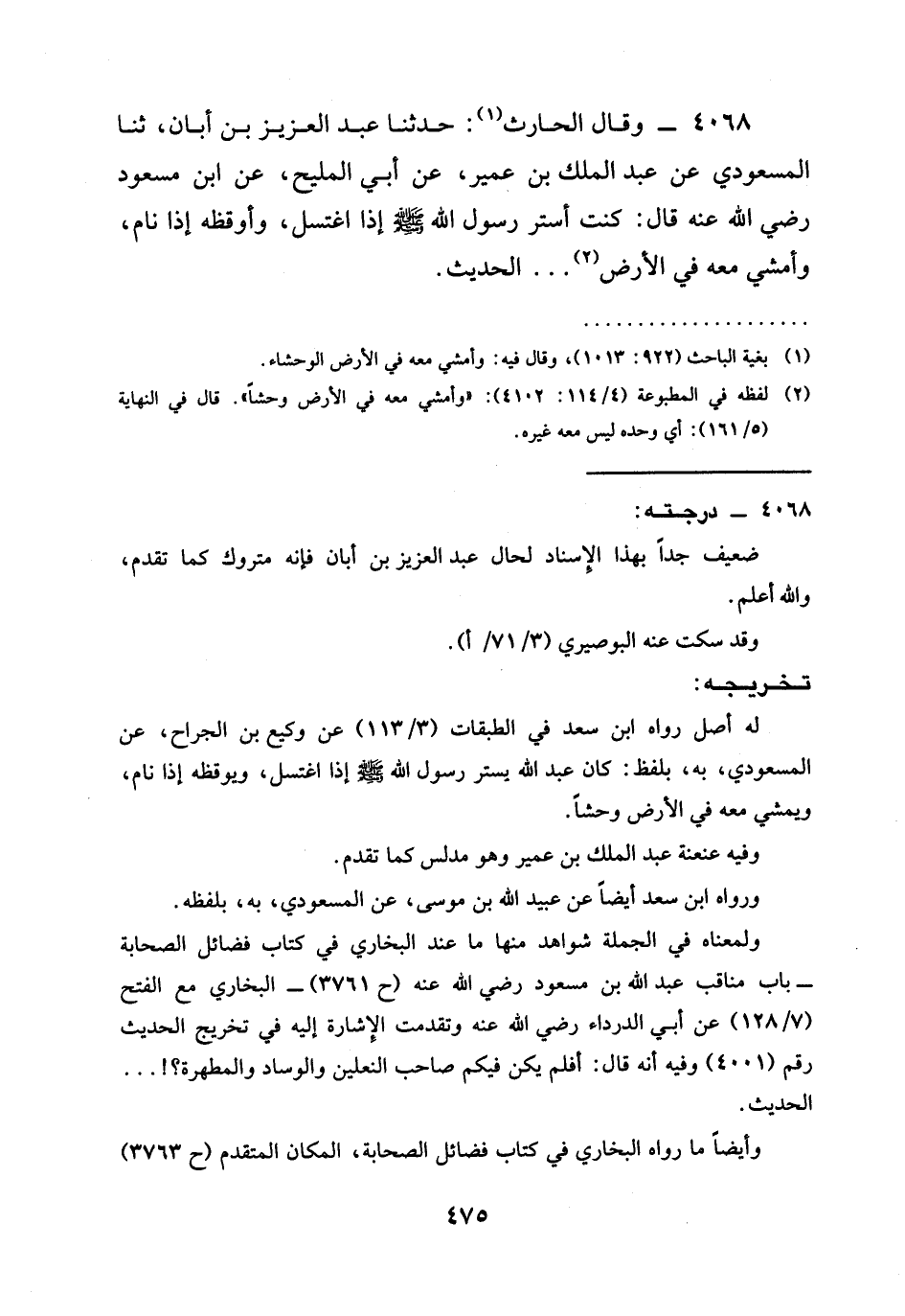 4068 - وَقَالَ الْحَارِثُ: حدثنا عَبْدُ الْعَزِيزِ بْنُ أَبَانَ، ثنا الْمَسْعُودِيُّ عَنْ عَبْدِ الْمَلِكِ بْنِ عُمَيْرٍ، عَنْ أَبِي الْمَلِيحِ، عَنِ ابْنِ مَسْعُودٍ رَضِيَ الله عَنْه قَالَ: كُنْتُ §أَسْتُرُ رَسُولَ اللَّهِ صَلَّى اللَّهُ عَلَيْهِ وَسَلَّمَ إِذَا اغْتَسَلَ، وَأُوقِظُهُ إِذَا نَامَ، وَأَمْشِي مَعَهُ فِي الْأَرْضِ ... الْحَدِيثَ.