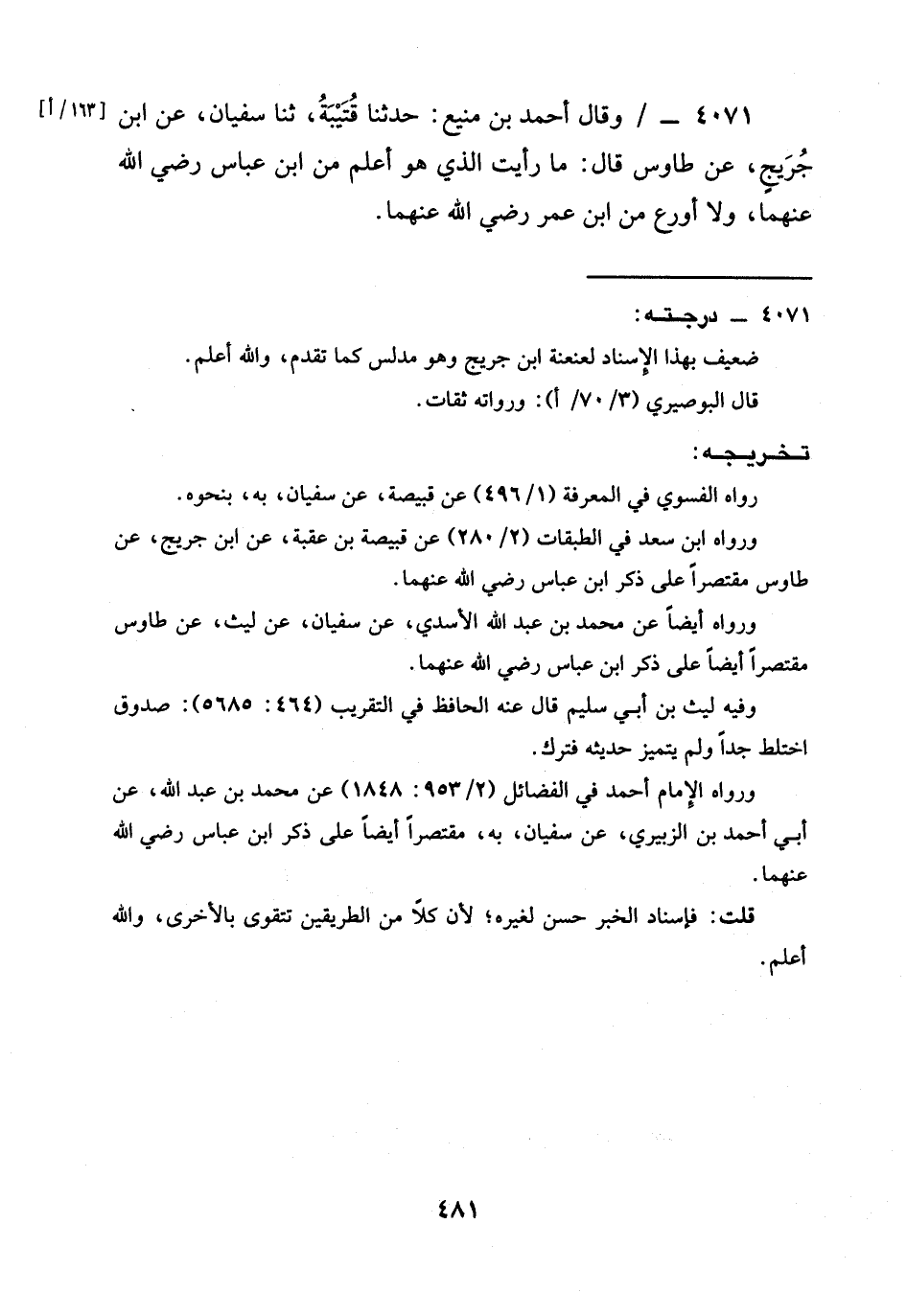4071 - / وَقَالَ أَحْمَدُ بْنُ مَنِيعٍ: حدثنا قُتَيْبَةُ، ثنا سُفْيَانُ، عَنِ ابْنِ جُرَيْجٍ، عَنْ طَاوُسٍ قَالَ: §مَا رَأَيْتُ الَّذِيَ هُوَ أَعْلَمُ مِنَ ابْنِ عباس رَضِيَ الله عَنْهما، وَلَا أَوْرَعَ مِنَ ابْنِ عُمَرَ رَضِيَ الله عَنْهما.