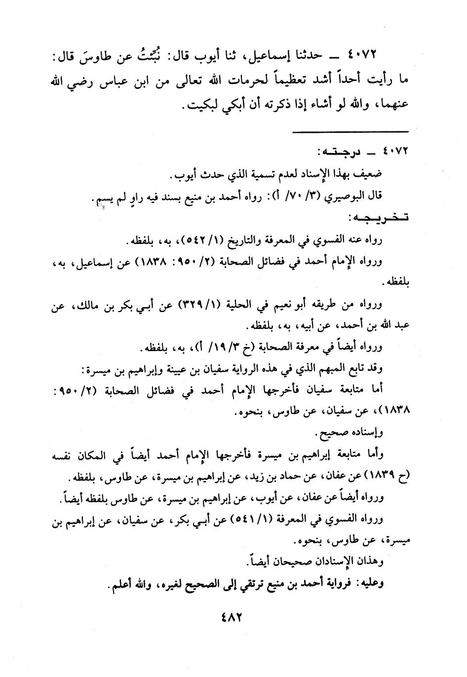 4072 - حَدَّثَنَا إِسْمَاعِيلُ، ثنا أيوب قال: نبئت عَنْ طَاوُسٍ قَالَ: §مَا رَأَيْتُ أَحَدًا أَشَدَّ تَعْظِيمًا لحرمات الله تعالى مِنَ ابْنِ عباس رَضِيَ الله عَنْهما، وَاللَّهِ لو أَشَاءُ إِذَا ذَكَرْتُهُ أَنْ أَبْكِيَ لَبَكَيْتُ.