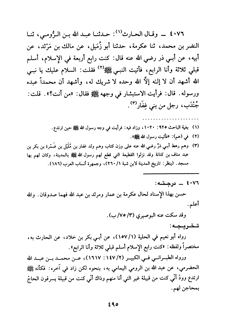 4076 - وَقَالَ الْحَارِثُ: حدثنا عَبْدُ اللَّهِ بْنُ الرُّومِيِّ، ثنا النَّضْرُ بْنُ مُحَمَّدٍ، ثنا عِكْرِمَةُ، حدثنا أَبُو زُمَيْلٍ، عَنْ مَالِكِ بْنِ مَرْثَدٍ، عَنْ أَبِيهِ، عَنْ أبي ذر رَضِيَ الله عَنْه قال: كُنْتُ §رَابِعَ أَرْبَعَةٍ فِي الْإِسْلَامِ، أَسْلَمَ قَبْلِي ثَلَاثَةٌ وَأَنَا الرابع، فأتيت النبي صَلَّى اللَّهُ عَلَيْهِ وَسَلَّمَ فَقُلْتُ: السَّلَامُ عَلَيْكَ يَا نَبِيَّ اللَّهِ أَشْهَدُ أَنْ لَا إِلَهَ إِلَّا اللَّهُ وَحْدَهُ لَا شَرِيكَ لَهُ، وَأَشْهَدُ أَنَّ مُحَمَّدًا عَبْدُهُ وَرَسُولُهُ. قَالَ: فَرَأَيْتُ الِاسْتِبْشَارَ فِي وَجْهِهِ صَلَّى اللَّهُ عَلَيْهِ وَسَلَّمَ فَقَالَ: " مَنْ أَنْتَ؟ ". قُلْتُ: جُنْدَبٌ، رَجُلٌ مِنْ بَنِي غِفَارٍ.