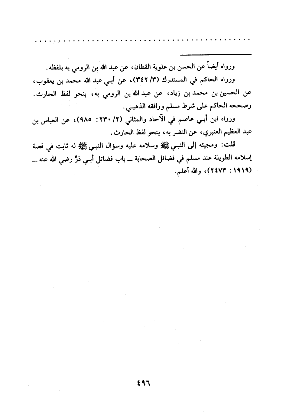 ورواه الحاكم في المستدرك (3/ 342)، عن أبي عبد الله محمَّد بن يعقوب، عن الحسين بن محمَّد بن زياد، عن عبد الله بن الرومى به، بنحو لفظ الحارث.