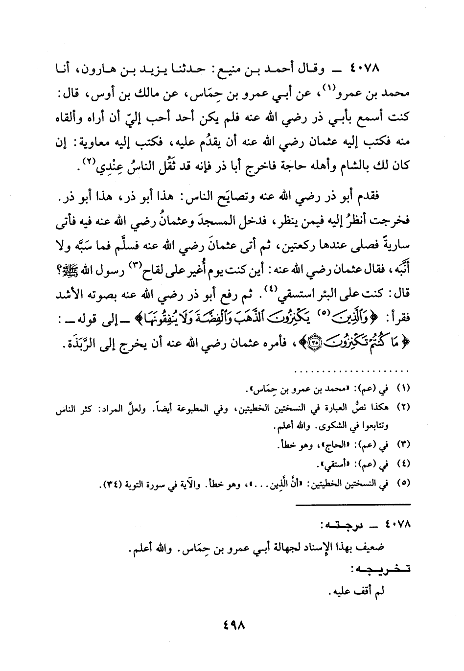 4078 - وَقَالَ أَحْمَدُ بْنُ مَنِيعٍ: حدثنا يَزِيدُ بْنُ هَارُونَ، أنا مُحَمَّدُ بْنُ عَمْرٍو، عَنْ أَبِي عَمْرِو بْنِ حِمَاسٍ، عَنْ مَالِكِ بْنِ أَوْسٍ، قَالَ: كُنْتُ أَسْمَعُ بِأَبِي ذَرٍّ رَضِيَ الله عَنْه فَلَمْ يَكُنْ أَحَدٌ أَحَبَّ إِلَيَّ أَنْ أَرَاهُ وَأَلْقَاهُ مِنْهُ §فَكَتَبَ إِلَيْهِ عُثْمَانُ رَضِيَ الله عَنْه أَنْ يَقْدَمَ عَلَيْهِ، فَكَتَبَ إِلَيْهِ مُعَاوِيَةُ: إِنْ كَانَ لَكَ بِالشَّامِ وَأَهْلِهِ حَاجَةٌ فَأَخْرِجْ أَبَا ذَرٍّ فَإِنَّهُ قَدْ ثَقُلَ النَّاسُ عِنْدِي.