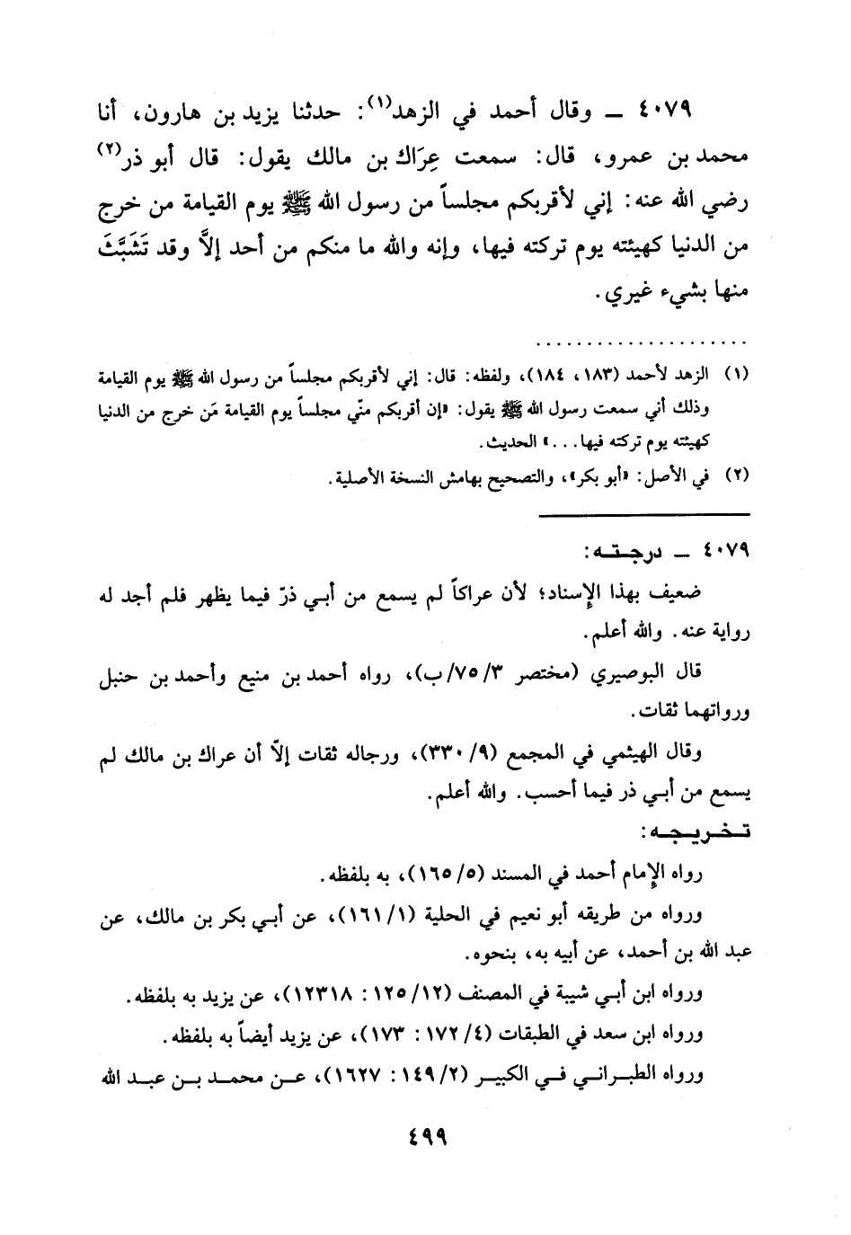 4079 - وَقَالَ أَحْمَدُ فِي الزُّهْدِ: حدثنا يَزِيدُ بْنُ هَارُونَ، أنا مُحَمَّدُ بْنُ عَمْرٍو، قَالَ: سَمِعْتُ عِرَاكَ بْنَ مَالِكٍ يَقُولُ: قَالَ أَبُو ذَرٍّ رَضِيَ الله عَنْه: إِنِّي لَأَقْرَبُكُمْ مَجْلِسًا مِنْ رَسُولِ اللَّهِ صَلَّى اللَّهُ عَلَيْهِ وَسَلَّمَ يَوْمَ الْقِيَامَةِ [[وَذَلِكَ أَنِّي سَمِعْتُ رَسُولَ اللَّهِ صَلَّى اللَّهُ عَلَيْهِ وَسَلَّمَ يَقُولُ: " §أَقْرَبُكُمْ مِنِّي مَجْلِسًا يَوْمَ الْقِيَامَةِ]] (*) مَنْ خَرَجَ مِنَ الدُّنْيَا كَهَيْئَتِهِ يَوْمَ تَرَكْتُهُ فِيهَا، وَإِنَّهُ وَاللَّهِ مَا مِنْكُمْ مِنْ أحد إلا وَقَدْ تَشَبَّثَ مِنْهَا بِشَيْءٍ غَيْرِي.