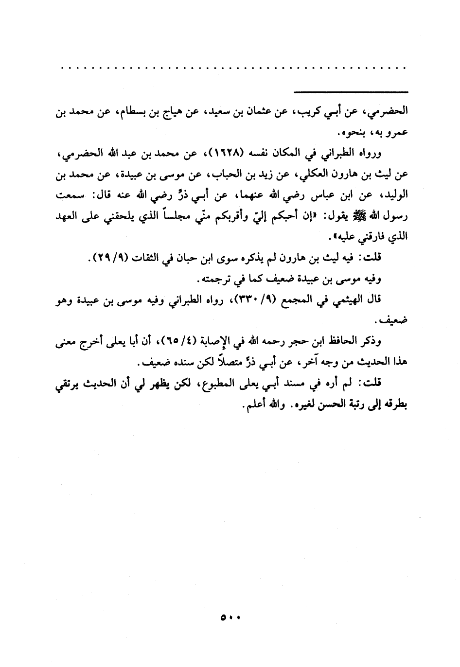 ورواه الطبراني في المكان نفسه (1628)، عن محمَّد بن عبد الله الحضرمي، عن ليث بن هارون العكلي، عن زَيْدُ بْنُ الْحُبَابِ، عَنْ مُوسَى بْنِ عُبَيْدَةَ، عن محمَّد بن الوليد، عن ابن عباس رضي الله عنهما، عَنْ أَبِي ذرٍّ رَضِيَ اللَّهُ عَنْهُ قَالَ: سمعت رسول الله -صلى الله عليه وسلم- يقول: "إن أحبكم إليّ وأقربكم منّي مجلسًا الذي يلحقني على العهد الذي فارقني عليه".