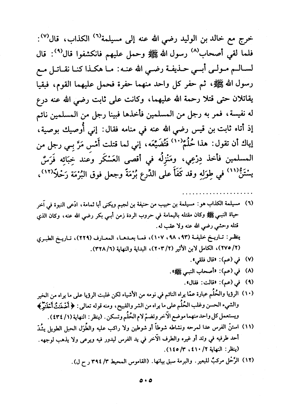 خرج مع خالد بن الوليد رضي الله عنه إلى مسيلمة (¬6) الكذاب، قال (¬7): فَلَمَّا لَقِيَ أَصْحَابَ (¬8) رَسُولِ اللَّهِ -صَلَّى اللَّهُ عليه وسلم- وحمل عليهم فانكشفوا قال (¬9): قال لسالم مولى أبي حذيفة رضي الله عنه: مَا هَكَذَا كُنَّا نُقَاتِلُ مَعَ رَسُولِ اللَّهِ -صَلَّى اللَّهُ عَلَيْهِ وَسَلَّمَ-، ثُمَّ حَفَرَ كُلُّ وَاحِدٍ مِنْهُمَا حُفْرَةً فَحَمَلَ عليهما القوم، فبقيا يقاتلان حتى قتلا رحمة الله عليهما، وكانت على ثابت رضي الله عنه دِرْعٌ لَهُ نَفِيسَةٌ، فَمَرَّ بِهِ رَجُلٌ مِنَ الْمُسْلِمِينَ فَأَخَذَهَا فَبَيْنَا رَجُلٌ مِنَ الْمُسْلِمِينَ نَائِمٌ إذ أتاه ثابت بن قيس رضي الله عنه فِي مَنَامِهِ فَقَالَ: إِنِّي أُوصيك بِوَصِيَّةٍ، إِيَّاكَ أَنْ تَقُولَ: هَذَا حُلُمٌ (¬10) فَتُضَيِّعَه، إِنِّي لَمَّا قُتِلْتُ أَمْسِ مَرَّ بِي رَجُلٌ مِنَ الْمُسْلِمِينِ فَأَخَذَ دِرْعيِ، ومَنْزِلُه فِي أَقْصَى العَسْكَر وَعِنْدَ خِبَائِه فَرَسٌ يسْتَنُّ (¬11) فِي طِوَلهِ وَقَدْ كَفَأَ عَلَى الدِّرع بُرْمَةً وَجَعَلَ فَوْقَ البُرْمَة رَحْلًا (¬12)،