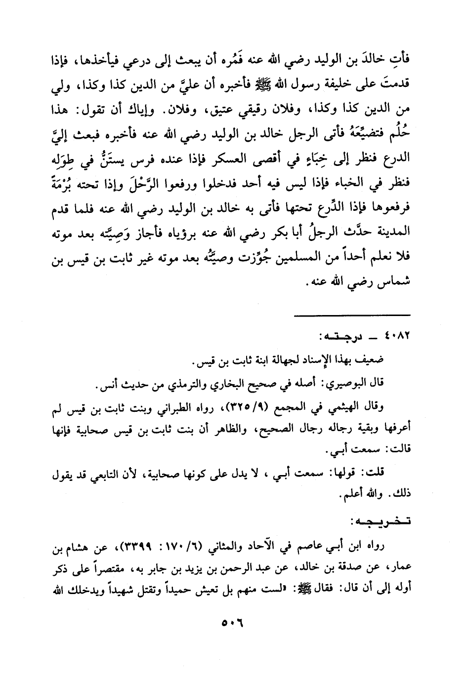 وقال الهيثمي في المجمع (9/ 325)، رواه الطبراني وبنت ثابت بن قيس لم أعرفها وبقية رجاله رجال الصحيح، والظاهر أن بنت ثابت بن قيس صحابية فإنها قالت: سمعت أبي.