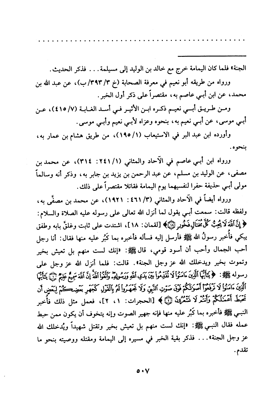 ورواه أيضًا في الآحاد والمثاني (3/ 461: 1921)، عن محمَّد بن مصفَّى به، ولفظه قالت: سمعت أبي يقول لما أنزل الله تعالى على رسوله عليه الصلاة والسلام: {إِنَّ اللَّهَ لَا يُحِبُّ كُلَّ مُخْتَالٍ فَخُورٍ} [لقمان: 18]، اشتدت على ثابت وغلقَّ بابه وطفق يبكي فأُخبر رسولُ اللَّهِ -صَلَّى اللَّهُ عَلَيْهِ وَسَلَّمَ- فأرسل إليه فسأله فأخبره مما كَبُر عليه منها فقال: أنا رجل أحب الجمال وأحب أن أسود قومي، قال -صلى الله عليه وسلم-: "إنك لَسْتَ مِنْهُمْ بَلْ تَعِيشُ بِخَيْرٍ وَتَمُوتُ بِخَيْرٍ ويدخلك الله عَزَّ وَجَلَّ الجنة". قالت: فلما أنزل الله عَزَّ وَجَلَّ على رسوله -صلى الله عليه وسلم-: {يَا أَيُّهَا الَّذِينَ آمَنُوا لَا تُقَدِّمُوا بَيْنَ يَدَيِ اللَّهِ وَرَسُولِهِ وَاتَّقُوا اللَّهَ إِنَّ اللَّهَ سَمِيعٌ عَلِيمٌ (1) يَا أَيُّهَا الَّذِينَ آمَنُوا لَا تَرْفَعُوا أَصْوَاتَكُمْ فَوْقَ صَوْتِ النَّبِيِّ وَلَا تَجْهَرُوا لَهُ بِالْقَوْلِ كَجَهْرِ بَعْضِكُمْ لِبَعْضٍ أَنْ تَحْبَطَ أَعْمَالُكُمْ وَأَنْتُمْ لَا تَشْعُرُونَ} [الحجرات: 1، 2]، فعمل مثل ذلك فأُخبر النبي -صلى الله عليه وسلم- فأخبره بما كَبُر عليه منها فإنه جهير الصوت وإنه يتخوف أن يكون ممن حبط عمله فقال النبي -صلى الله عليه وسلم-: "إنك لست منهم بل تعيش بخير وتقتل شهيدًا ويُدخلك الله عَزَّ وَجَلَّ الجنة" ... فذكر بقية الخبر في مسيره إلى اليمامة ومقتله ووصية بنحو ما تقدم. =