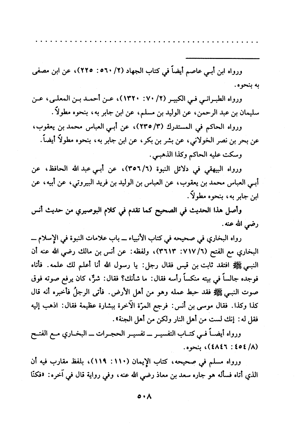 ورواه مسلم في صحيحه، كتاب الأيمان (110: 119)، بلفظ مقارب فيه أن الذي أتاه فسأله هو جاره سعد بن معاذ رضي الله عنه، وفي رواية قال في آخره: " فكنّا =