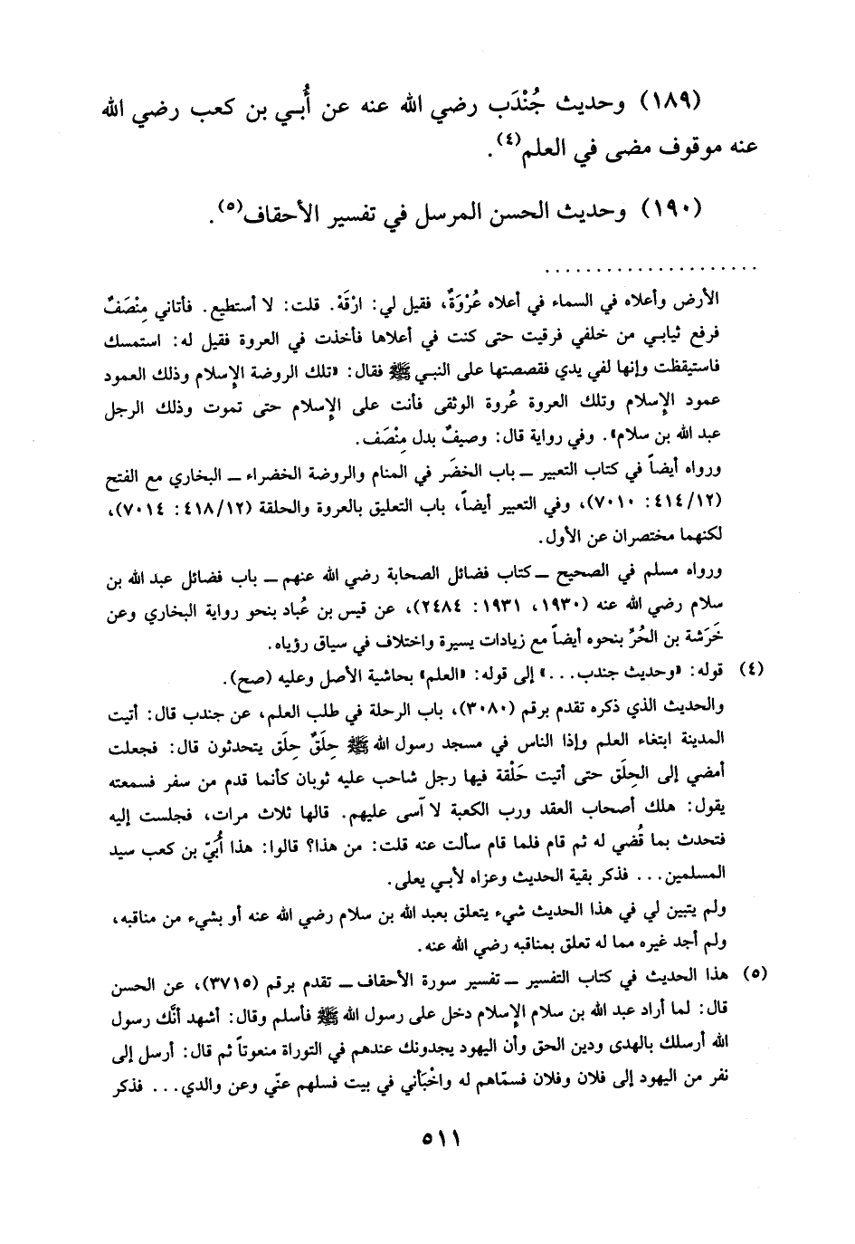 (189) وحديث جُنْدَب رضي الله عنه عَنْ أُبي بْنِ كَعْبٍ رَضِيَ اللَّهُ عَنْهُ مَوْقُوفٌ مَضَى فِي الْعِلْمِ (¬4).