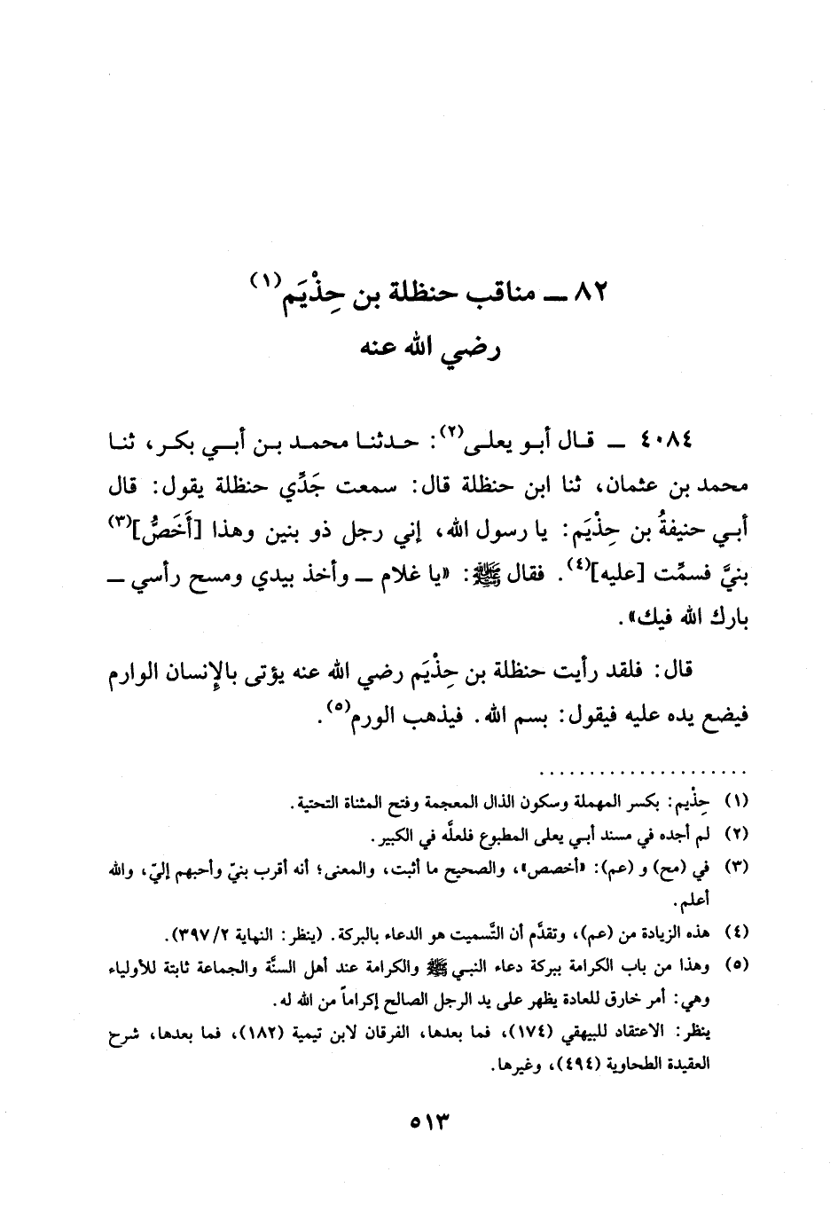 4084 - قَالَ أَبُو يَعْلَى: حدثنا مُحَمَّدُ بْنُ أَبِي بَكْرٍ، ثنا مُحَمَّدُ بْنُ عُثْمَانَ، ثنا ابْنُ حَنْظَلَةَ قَالَ: سَمِعْتُ جَدِّيَ حَنْظَلَةَ يَقُولُ: قَالَ أَبِي حَنِيفَةُ بْنُ حِذْيَمٍ: يَا رَسُولَ اللَّهِ، إِنِّي رَجُلٌ ذُو بنين وهذا [أخص] بَنِيِّ فَسَمَتَ [عَلَيْهِ] . فَقَالَ صَلَّى اللَّهُ عَلَيْهِ وَسَلَّمَ: " يَا غُلَامُ - §وَأَخَذَ بِيَدِي وَمَسَحَ رَأْسِي - بَارَكَ اللَّهُ فِيكَ ".