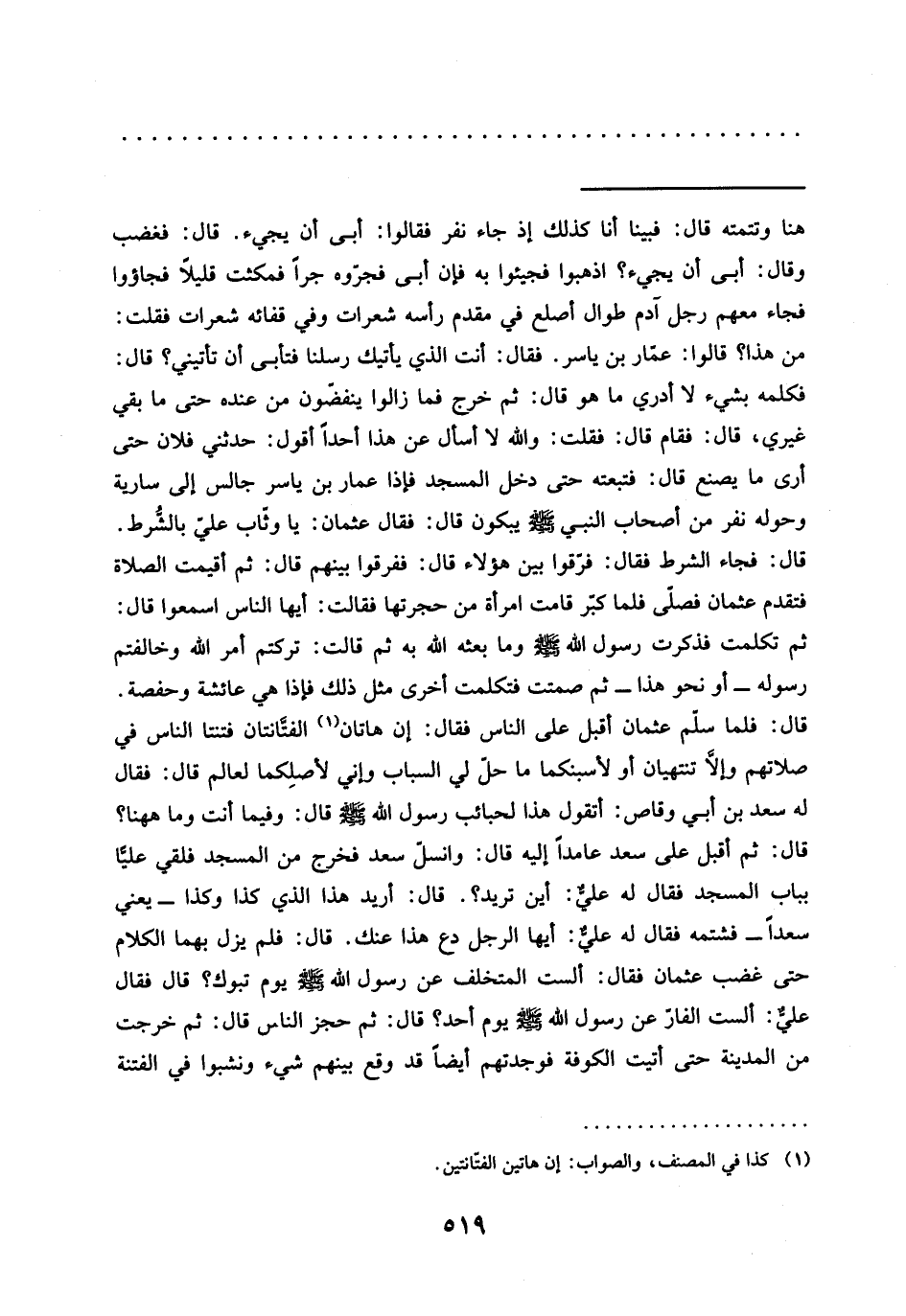 = هنا وتتمته قال: فبينا أنا كذلك إذ جاء نفر فقالوا: أبى أن يجيء. قال: فغضب وقال: أبى أن يجيء؟ اذهبوا فجيئوا به فإن أبى فجرّوه جرًا فمكثت قليلًا فجاؤوا فجاء معهم رجل آدم طوال أصلع في مقدم رأسه شعرات وفي قفائه شعرات فقلت: من هذا؟ قالوا: عمّار بن ياسر. فقال: أنت الذي يأتيك رسلنا فتأبى أن تأتيني؟ قال: فكلمه بشيء لا أدري ما هو قال: ثم خرج فما زالوا ينفضّون من عنده حتى ما بقي غيري، قال: فقام قال: فقلت: والله لا أسأل عن هذا أحدًا أقول: حدثني فلان حتى أرى ما يصنع قال: فتبعته حتى دخل المسجد فإذا عمار بن ياسر جالس إلى سارية وحوله نفر مِنْ أَصْحَابِ النَّبِيِّ -صَلَّى اللَّهُ عَلَيْهِ وَسَلَّمَ- يبكون قال: فقال عثمان: يا وثّاب عليّ بالشُّرط.