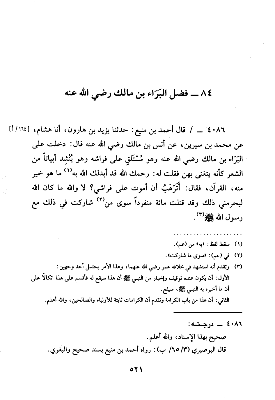 4086 - / قَالَ أَحْمَدُ بْنُ مَنِيعٍ: حَدَّثَنَا يَزِيدُ بْنُ هَارُونَ، أنا هِشَامٌ، عَنْ مُحَمَّدِ بْنِ سِيرِينَ، عَنْ أَنَسِ بْنِ مَالِكٍ رَضِيَ الله عَنْه قَالَ: §دَخَلْتُ عَلَى الْبَرَاءِ بْنِ مَالِكٍ رَضِيَ الله عَنْه وَهُوَ مُسْتَلْقٍ عَلَى فِرَاشِهِ وَهُوَ يُنْشِدُ أَبْيَاتًا مِنَ الشَّعْرِ كَأَنَّهُ يَتَغَنَّى بِهِنَّ فَقُلْتُ لَهُ: رَحِمَكَ اللَّهُ قَدْ أَبْدَلَكَ اللَّهُ بِهِ مَا هُوَ خَيْرٌ مِنْهُ، الْقُرْآنُ، فَقَالَ: أَتَرْهَبُ أَنْ أَمُوتَ عَلَى فِرَاشِي؟ لَا وَاللَّهِ مَا كَانَ اللَّهُ لِيَحْرِمَنِي ذَلِكَ وَقَدْ قَتَلْتُ مِائَةً مُنْفَرِدًا سِوَى مَنْ شَارَكْتُ فِي ذَلِكَ مَعَ رَسُولِ اللَّهِ صَلَّى اللَّهُ عَلَيْهِ وَسَلَّمَ.