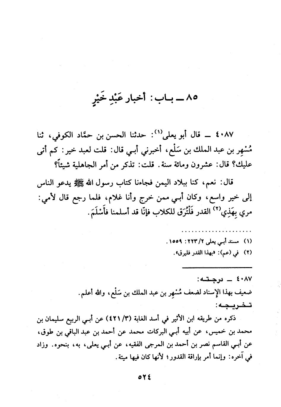 4087 - قَالَ أَبُو يَعْلَى: حَدَّثَنَا الْحَسَنُ بْنُ حَمَّادٍ الْكُوفِيُّ، ثنا مُسْهِرُ بْنُ عَبْدِ الْمَلِكِ بْنِ سَلْعٍ، أَخْبَرَنِي أَبِي قَالَ: قُلْتُ لِعَبْدِ خَيْرٍ: كَمْ أَتَى عَلَيْكَ؟ قَالَ: عِشْرُونَ وَمِائَةُ سَنَةٍ. قُلْتُ: تَذْكُرُ مِنْ أَمْرِ الْجَاهِلِيَّةِ شَيْئًا؟