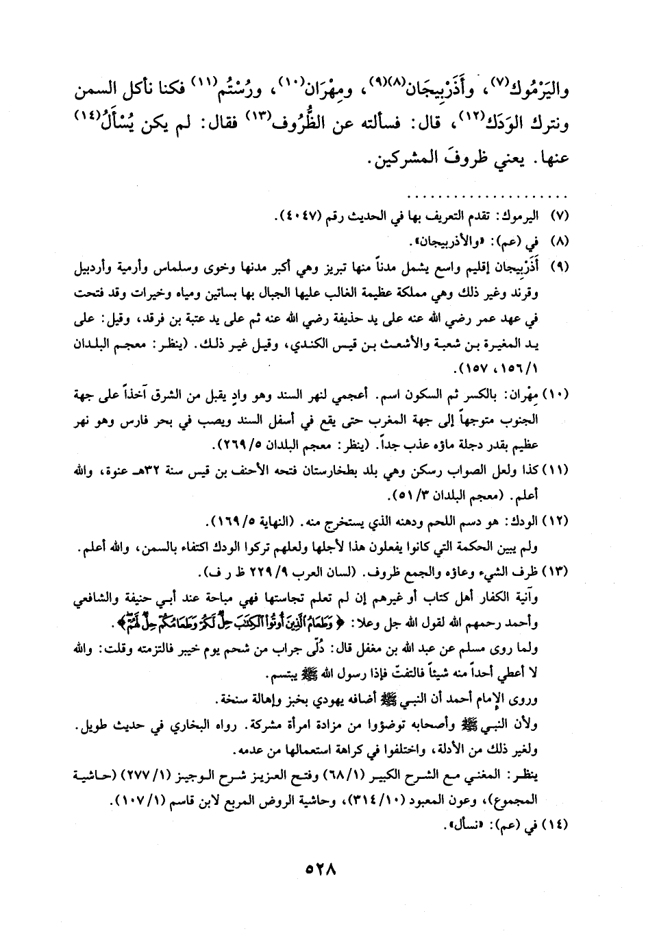 واليَرْمُوك (¬7)، وأَذَرْبِيجَان (¬8) (¬9)، ومِهْرَان (¬10)، ورُسْتُم (¬11) فَكُنَّا نَأْكُلُ السَّمْنَ وَنَتْرُكُ الوَدَك (¬12)، قَالَ: فَسَأَلْتُهُ عَنِ الظُّرُوف (¬13) فَقَالَ: لم يكن يُسْأَلُ (¬14) عنها. يعني ظروفَ المشركين.