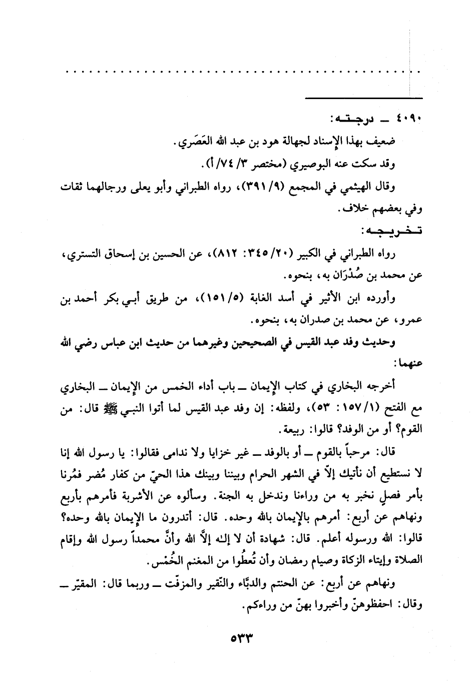 وحديث وفد عبد القيس في الصحيحين وغيرهما من حديث ابن عباس رضي الله عنهما: أخرجه البخاري في كتاب الإِيمان -باب أداء الخمس من الإِيمان- البخاري مع الفتح (1/ 157: 53)، ولفظه: إن وقد عبد القيس لما أتوا النبي -صلى الله عليه وسلم- قال: من القوم؟ أو من الوفد؟ قالوا: ربيعة.