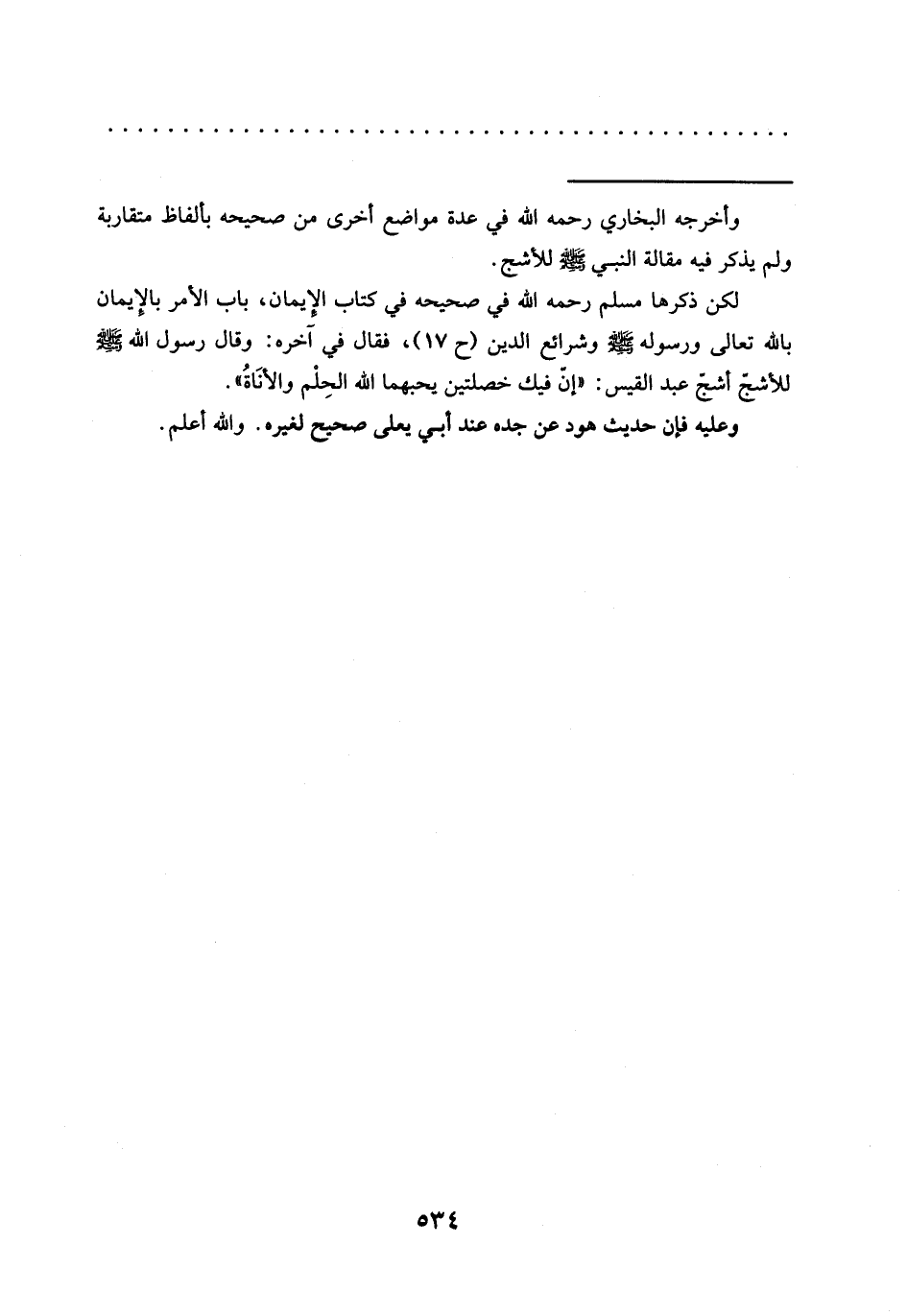 = وأخرجه البخاري رحمه الله في عدة مواضع أخرى من صحيحه بألفاظ متقاربة ولم يذكر فيه مقالة النبي -صلى الله عليه وسلم- للأشج.
