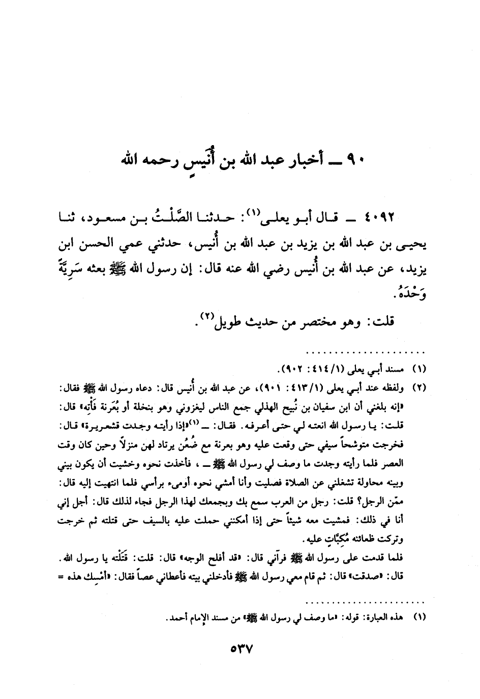 4092 - قَالَ أَبُو يَعْلَى: حَدَّثَنَا الصلت بن مسعود، ثنا يحيى بن عبد الله بن يزيد بن عبد الله بن أنيس، حدثني عمي الحسن ابن يزيد، عَنْ عَبْدِ اللَّهِ بن أنيس رَضِيَ الله عَنْه قال: أَنَّ رَسُولَ اللَّهِ صَلَّى اللَّهُ عَلَيْهِ وَسَلَّمَ §بَعَثَهُ سَرِيَّةً وَحْدَهُ.