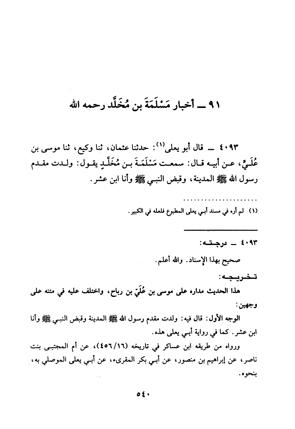 4093 - قَالَ أَبُو يَعْلَى: حَدَّثَنَا عُثْمَانُ، ثنا وَكِيعٌ، ثنا مُوسَى بْنُ عَلِيٍّ، عَنْ أَبِيهِ قَالَ: سَمِعْتُ مَسْلَمَةَ بْنَ مُخَلَّدٍ يَقُولُ: §وُلِدْتُ مَقْدِمَ رَسُولَ اللَّهِ صَلَّى اللَّهُ عَلَيْهِ وَسَلَّمَ الْمَدِينَةُ، وقبض النبي صَلَّى اللَّهُ عَلَيْهِ وَسَلَّمَ وَأَنَا ابْنُ عَشْرِ.