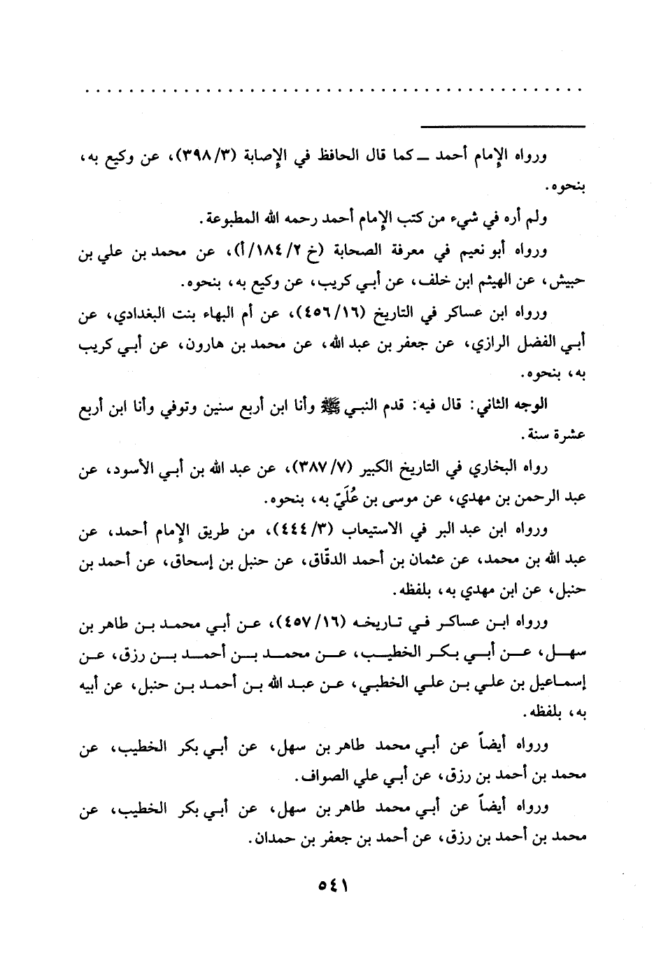 ورواه ابن عبد البر في الاستيعاب (3/ 444)، من طريق الإِمام أحمد، عن عبد الله بن محمَّد، عن عثمان بن أحمد الدقّاق، عن حنبل بن إسحاق، عن أحمد بن حنبل، عن ابن مهدي به، بلفظه.